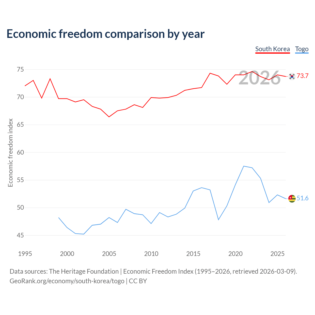 The Economic Freedom Index for South Korea is 73.7, ranking 24/197, compared to 51.6 for Togo, ranking 153/197. The chart above displays a comparison of annual changes in economic freedom indexes.