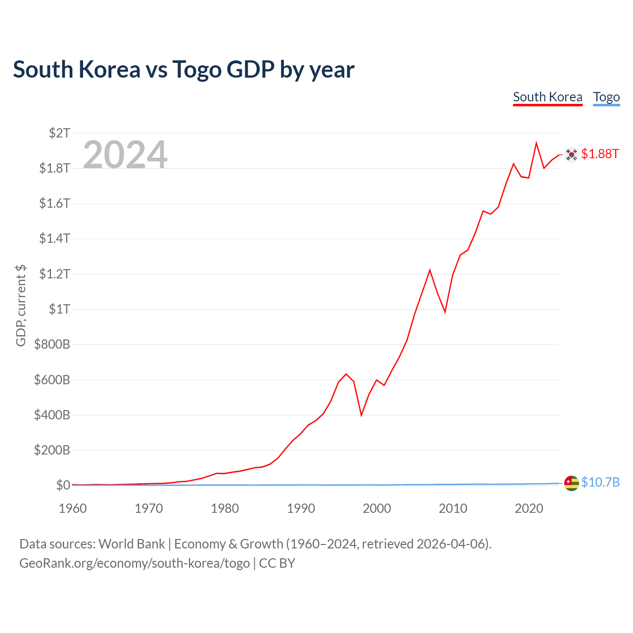 South Korea has a GDP of $1.88T compared to $10.7B for Togo, ranking 12/197 and 154/197 by economy size, respectively.