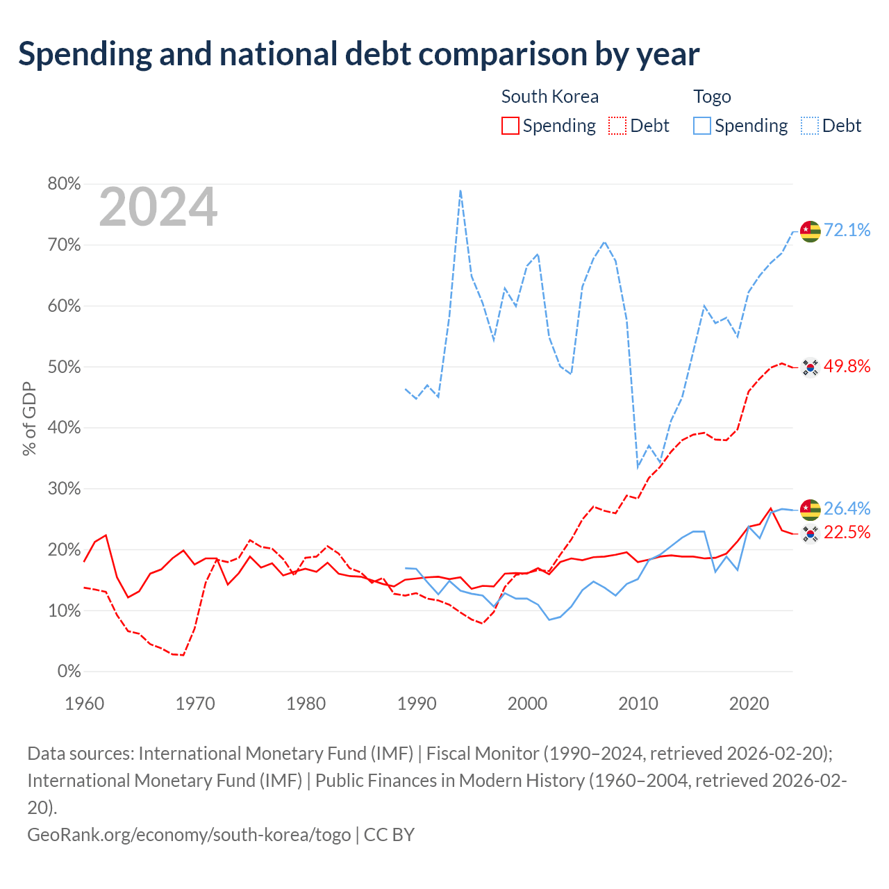 South Korea has $934B in government debt (49.8% of GDP), compared to $7.68B (72.1% of GDP) in Togo.