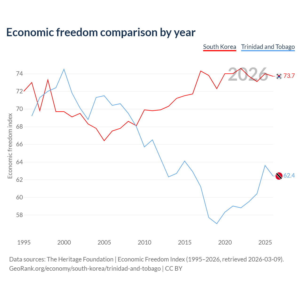 The Economic Freedom Index for South Korea is 73.7, ranking 24/197, compared to 62.4 for Trinidad and Tobago, ranking 87/197. The chart above displays a comparison of annual changes in economic freedom indexes.