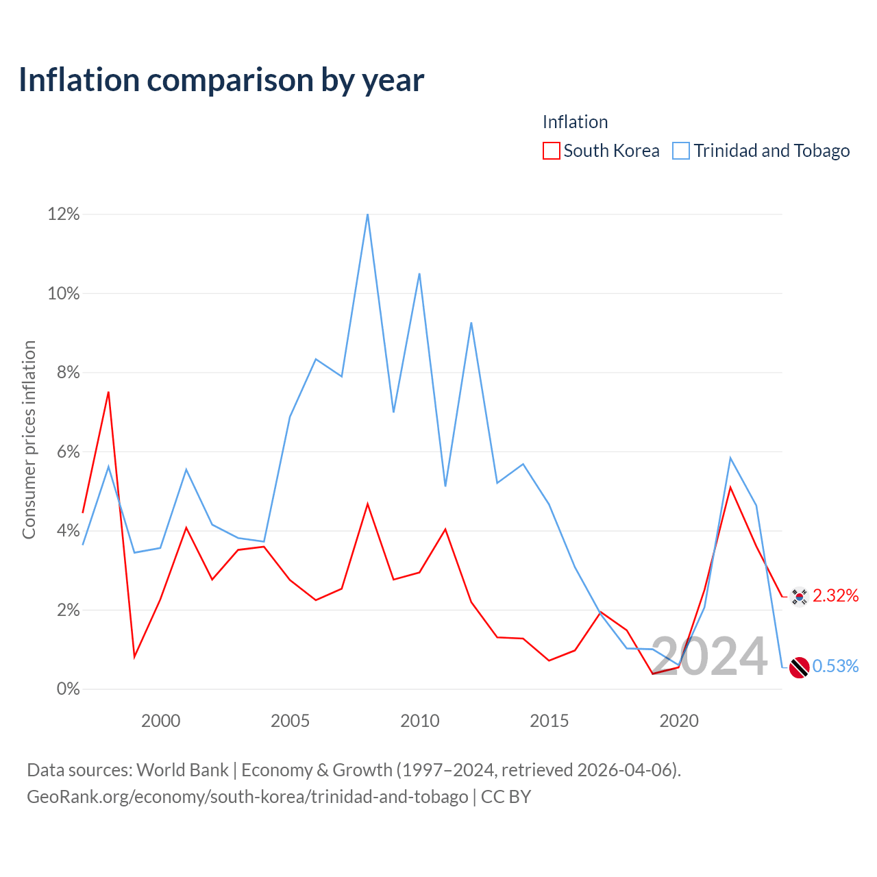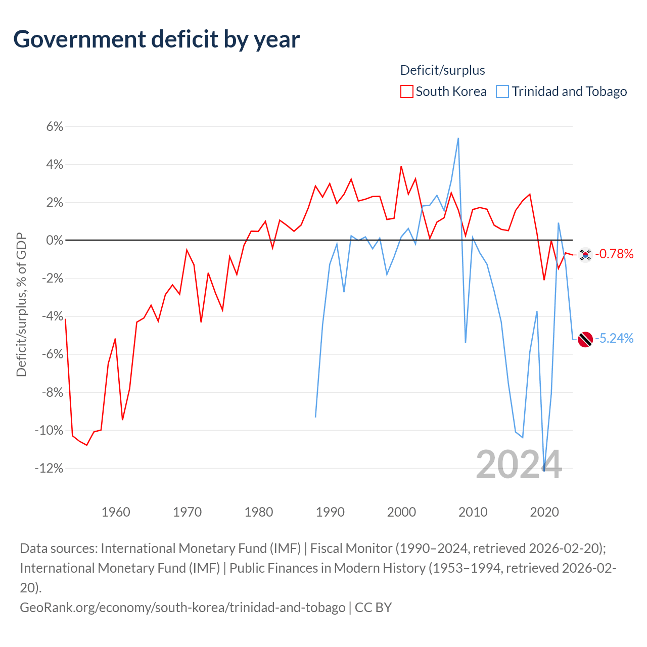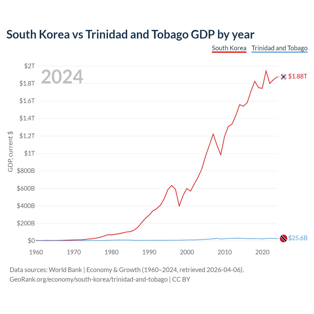 South Korea has a GDP of $1.88T compared to $25.6B for Trinidad and Tobago, ranking 12/197 and 115/197 by economy size, respectively.