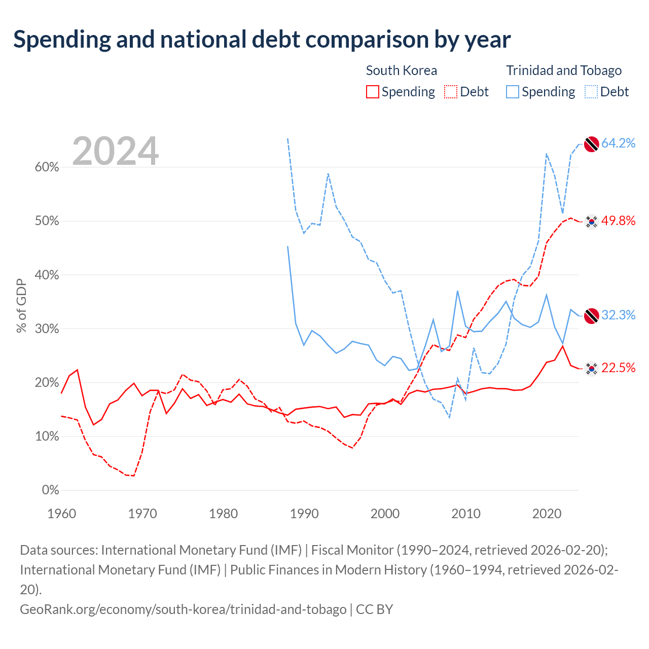 South Korea has $934B in government debt (49.8% of GDP), compared to $16.5B (64.2% of GDP) in Trinidad and Tobago.