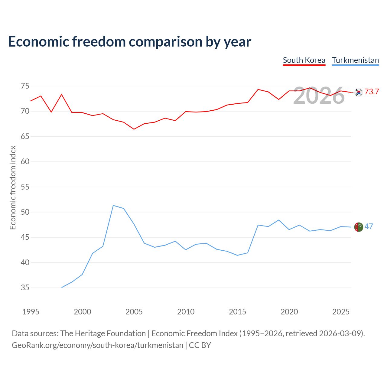 The Economic Freedom Index for South Korea is 73.7, ranking 24/197, compared to 47 for Turkmenistan, ranking 177/197. The chart above displays a comparison of annual changes in economic freedom indexes.