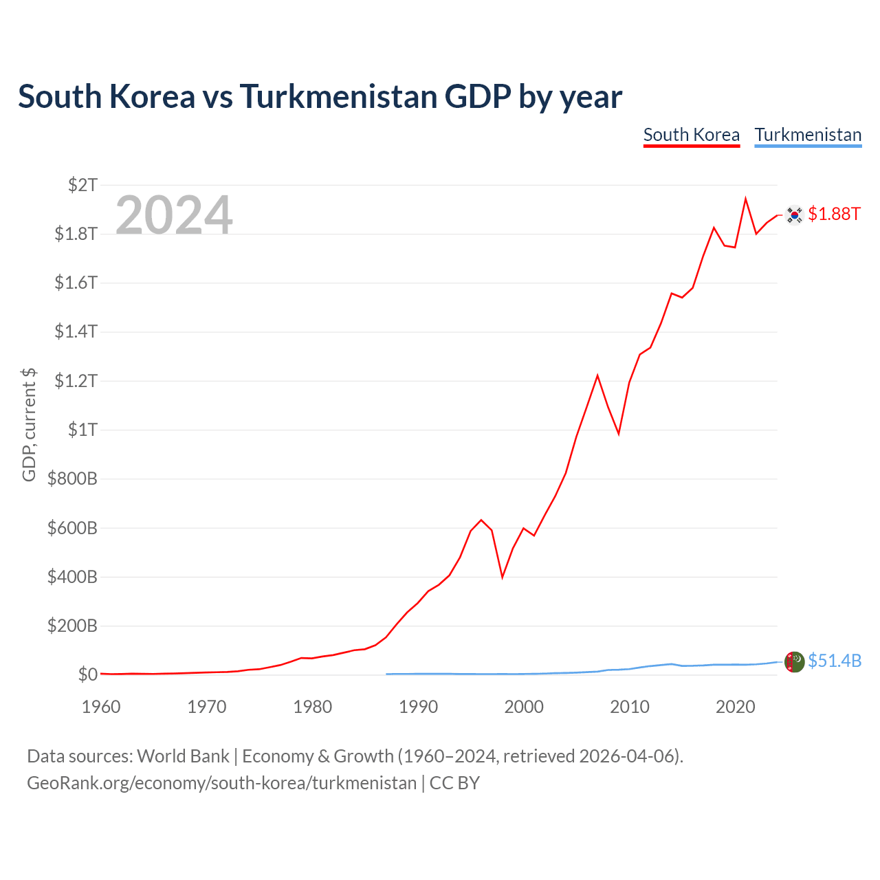 South Korea has a GDP of $1.88T compared to $51.4B for Turkmenistan, ranking 12/197 and 92/197 by economy size, respectively.