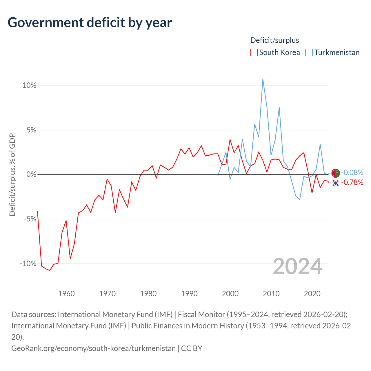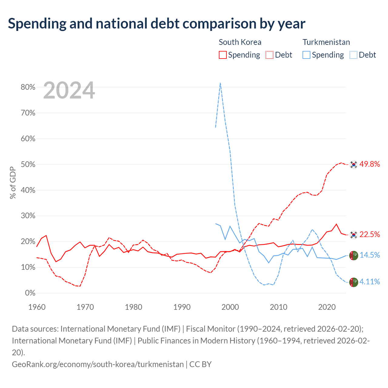 South Korea has $934B in government debt (49.8% of GDP), compared to $2.11B (4.11% of GDP) in Turkmenistan.