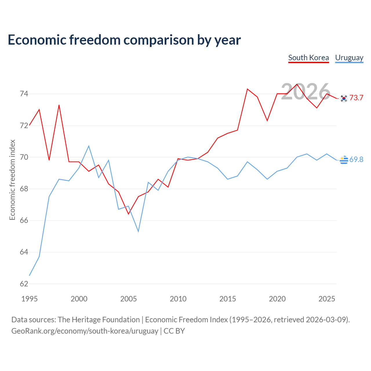 The Economic Freedom Index for South Korea is 73.7, ranking 24/197, compared to 69.8 for Uruguay, ranking 39/197. The chart above displays a comparison of annual changes in economic freedom indexes.
