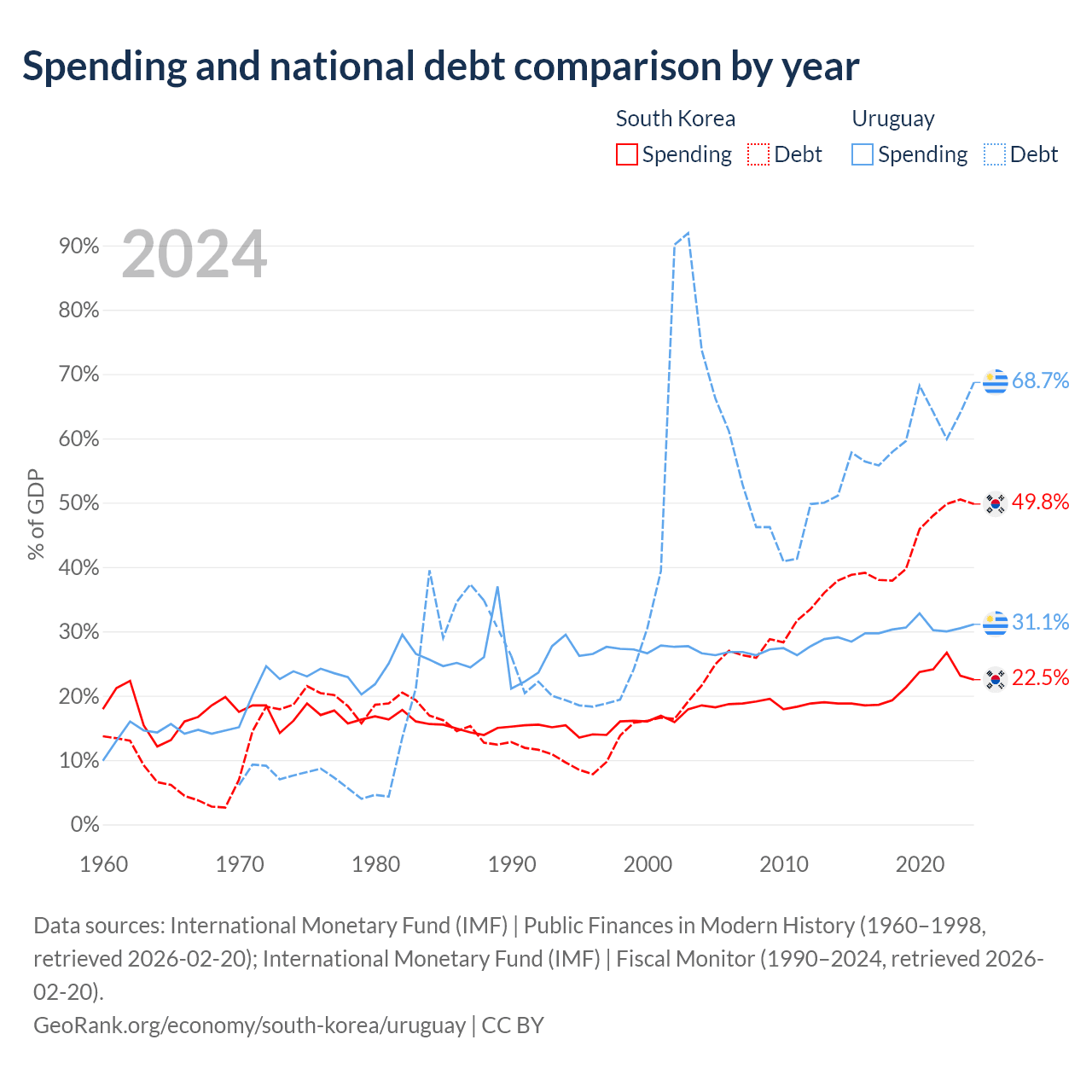 South Korea has $934B in government debt (49.8% of GDP), compared to $55.6B (68.7% of GDP) in Uruguay.