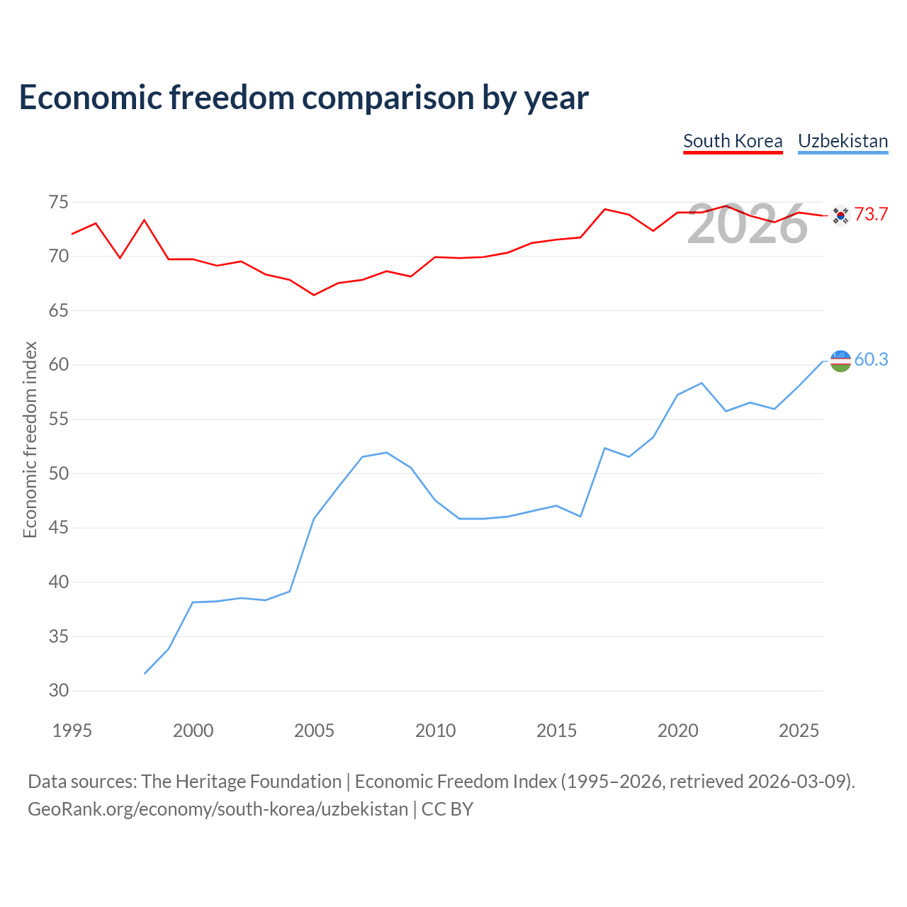 The Economic Freedom Index for South Korea is 73.7, ranking 24/197, compared to 60.3 for Uzbekistan, ranking 94/197. The chart above displays a comparison of annual changes in economic freedom indexes.