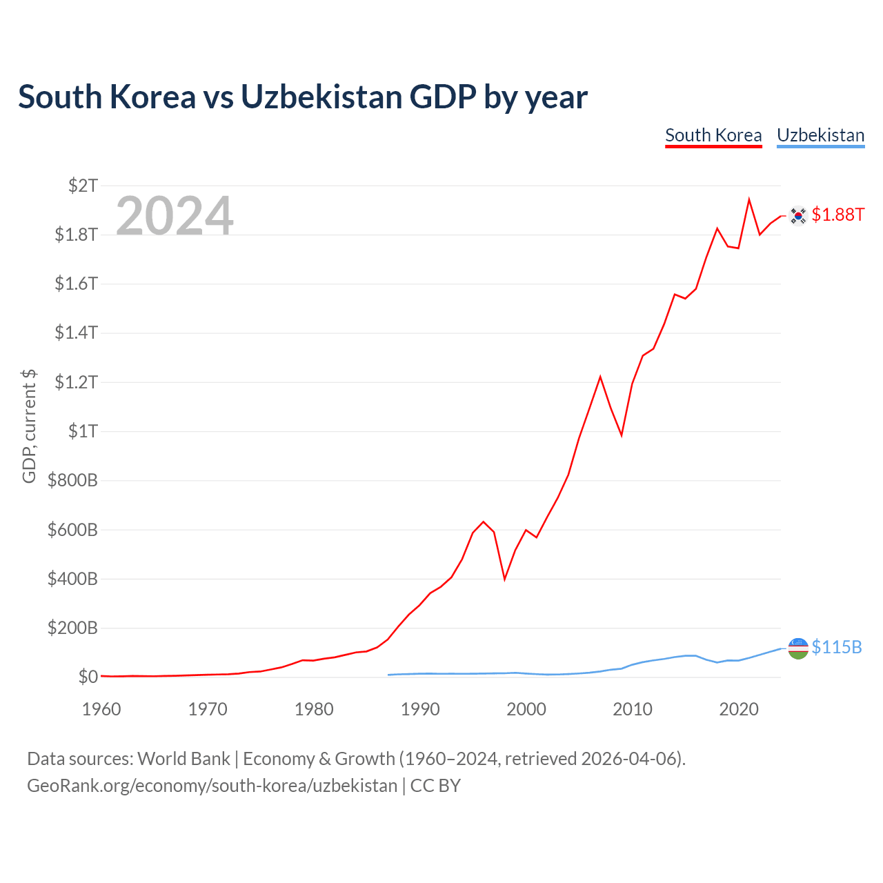 South Korea has a GDP of $1.88T compared to $115B for Uzbekistan, ranking 12/197 and 66/197 by economy size, respectively.