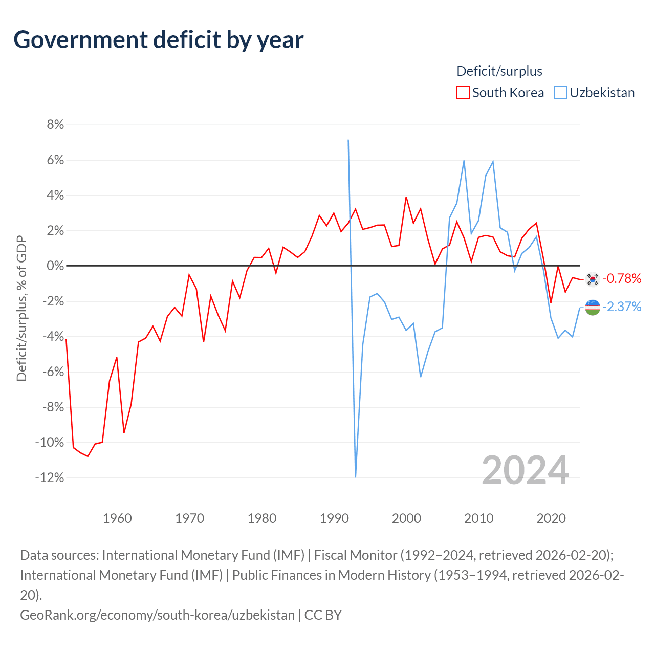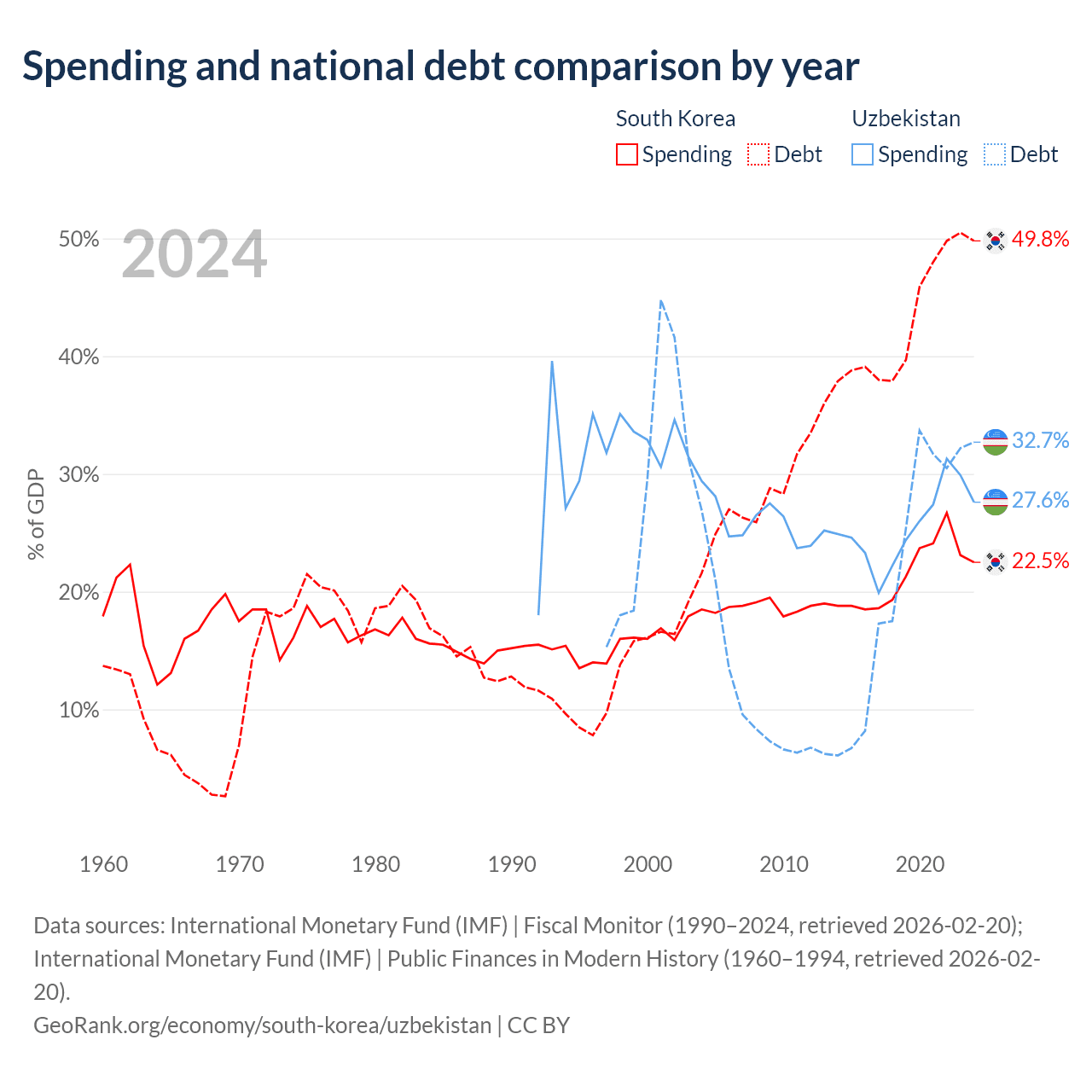 South Korea has $934B in government debt (49.8% of GDP), compared to $37.5B (32.7% of GDP) in Uzbekistan.