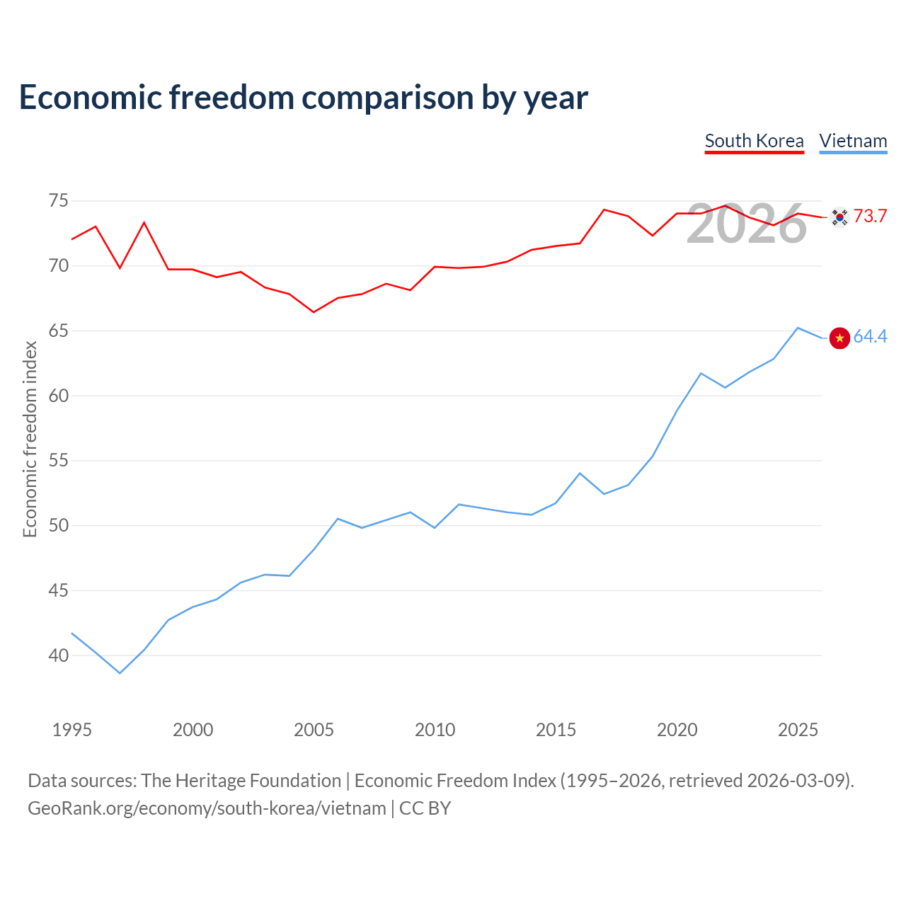 The Economic Freedom Index for South Korea is 73.7, ranking 24/197, compared to 64.4 for Vietnam, ranking 73/197. The chart above displays a comparison of annual changes in economic freedom indexes.