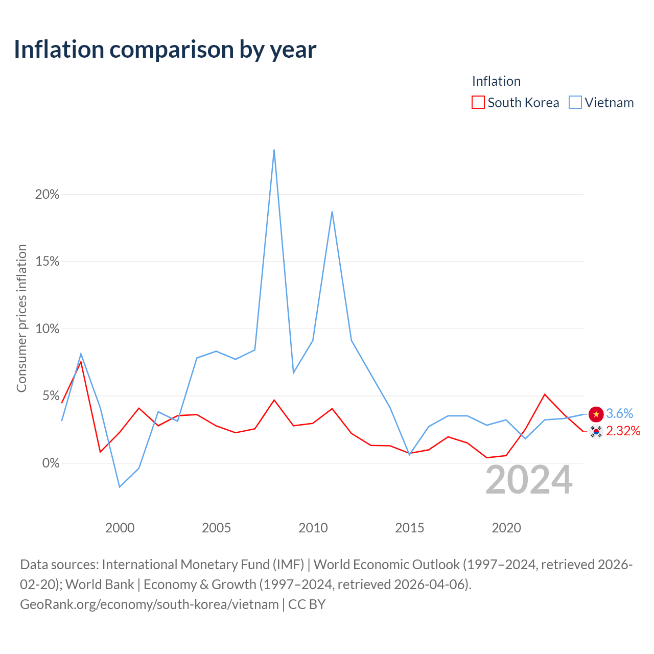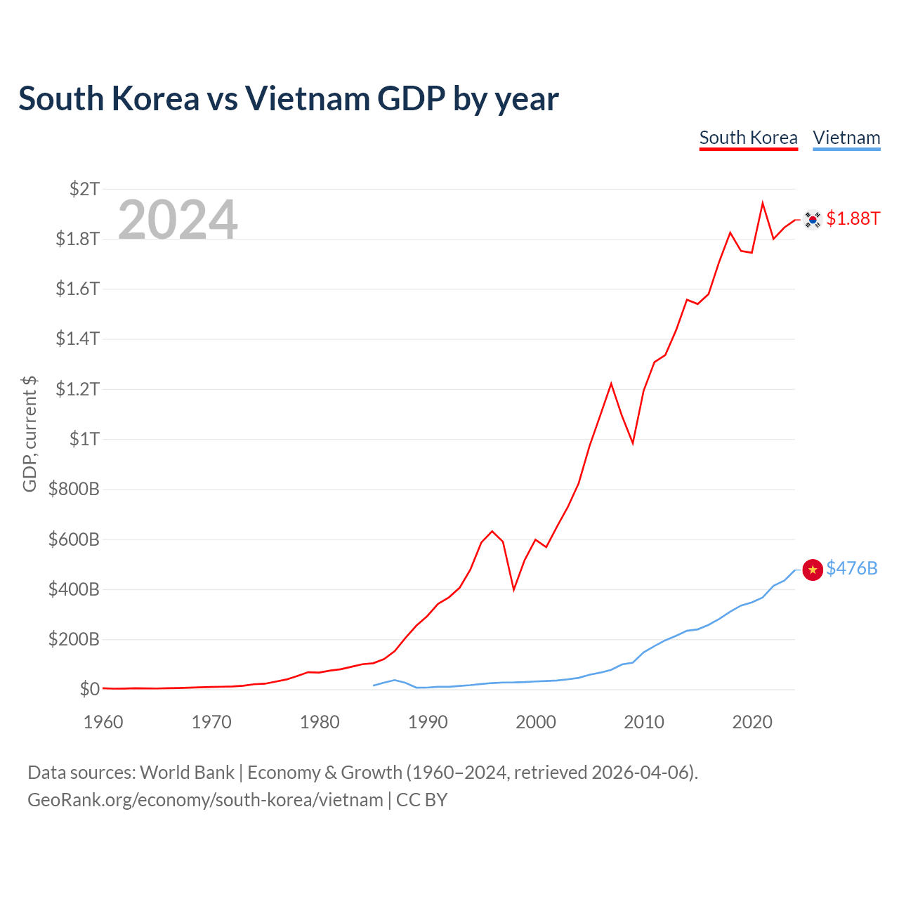 South Korea has a GDP of $1.88T compared to $476B for Vietnam, ranking 12/197 and 33/197 by economy size, respectively.