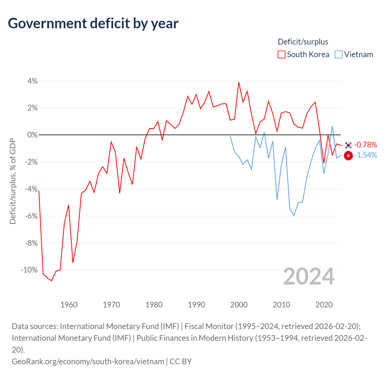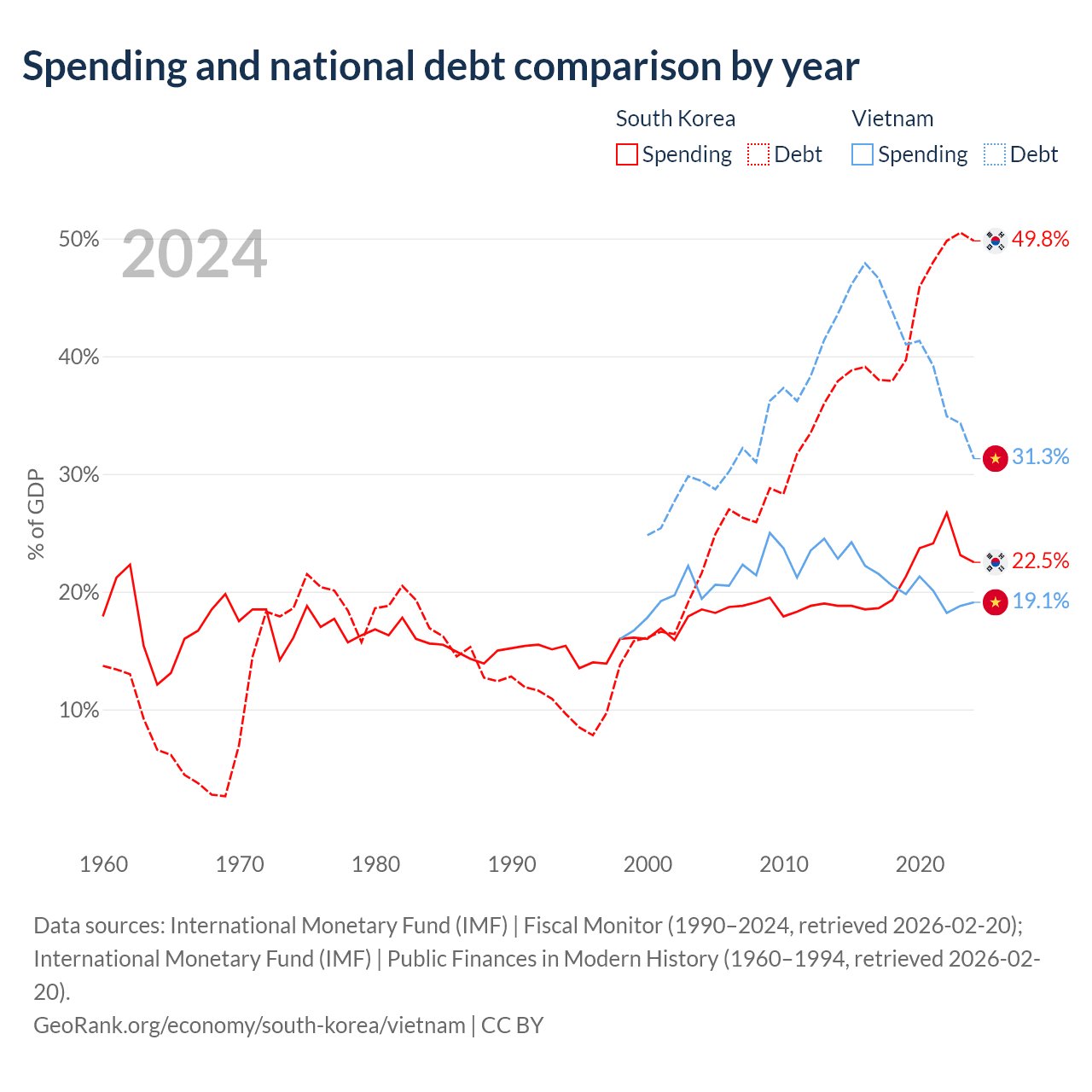 South Korea has $934B in government debt (49.8% of GDP), compared to $149B (31.3% of GDP) in Vietnam.
