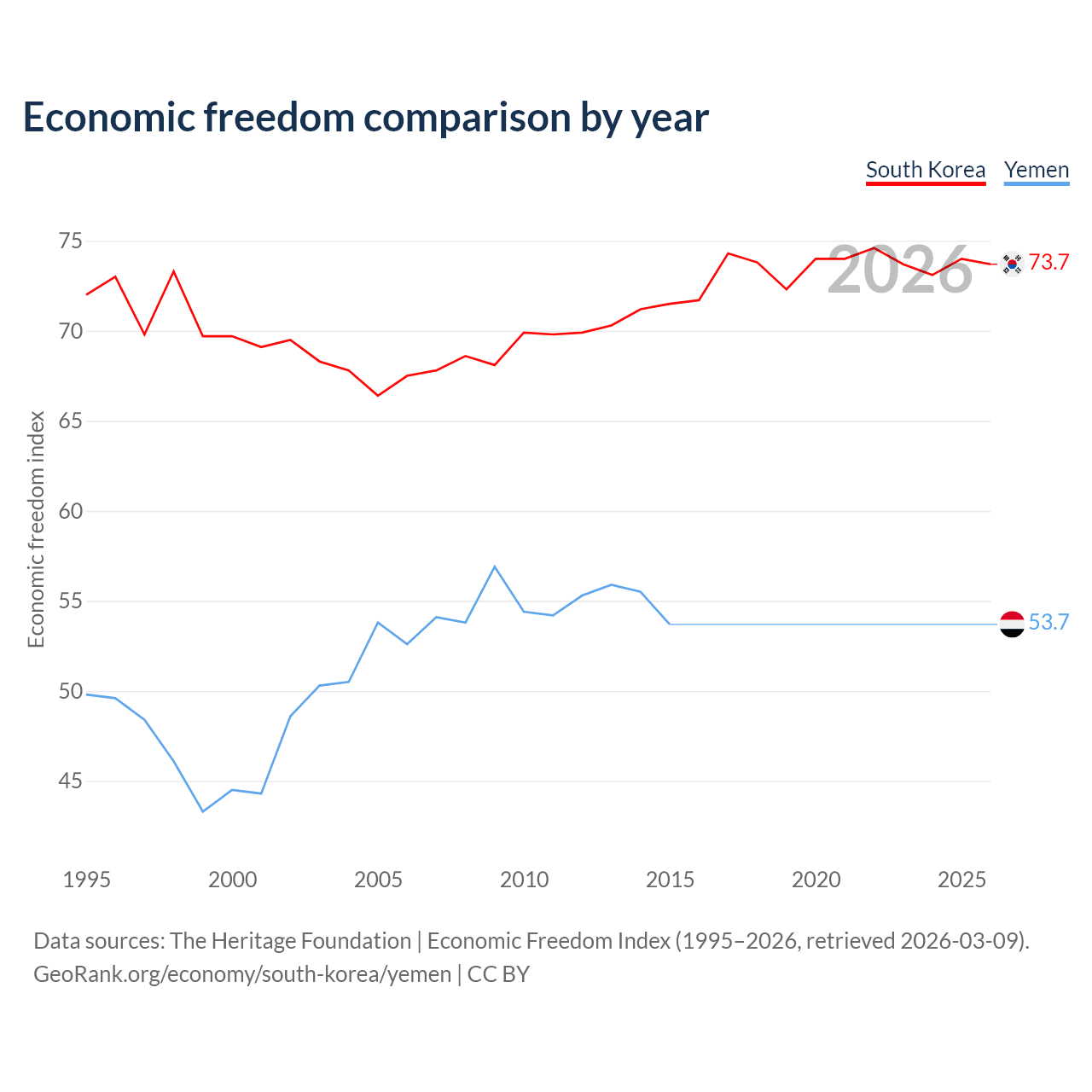The Economic Freedom Index for South Korea is 73.7, ranking 24/197, compared to 53.7 for Yemen, ranking 138/197. The chart above displays a comparison of annual changes in economic freedom indexes.