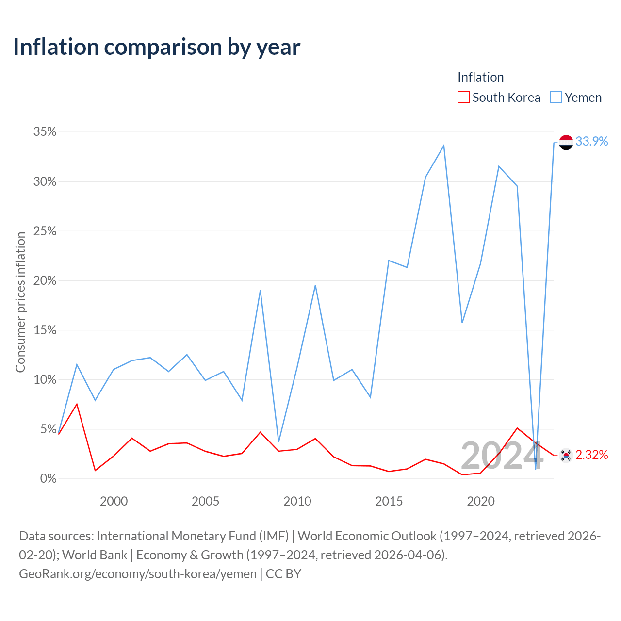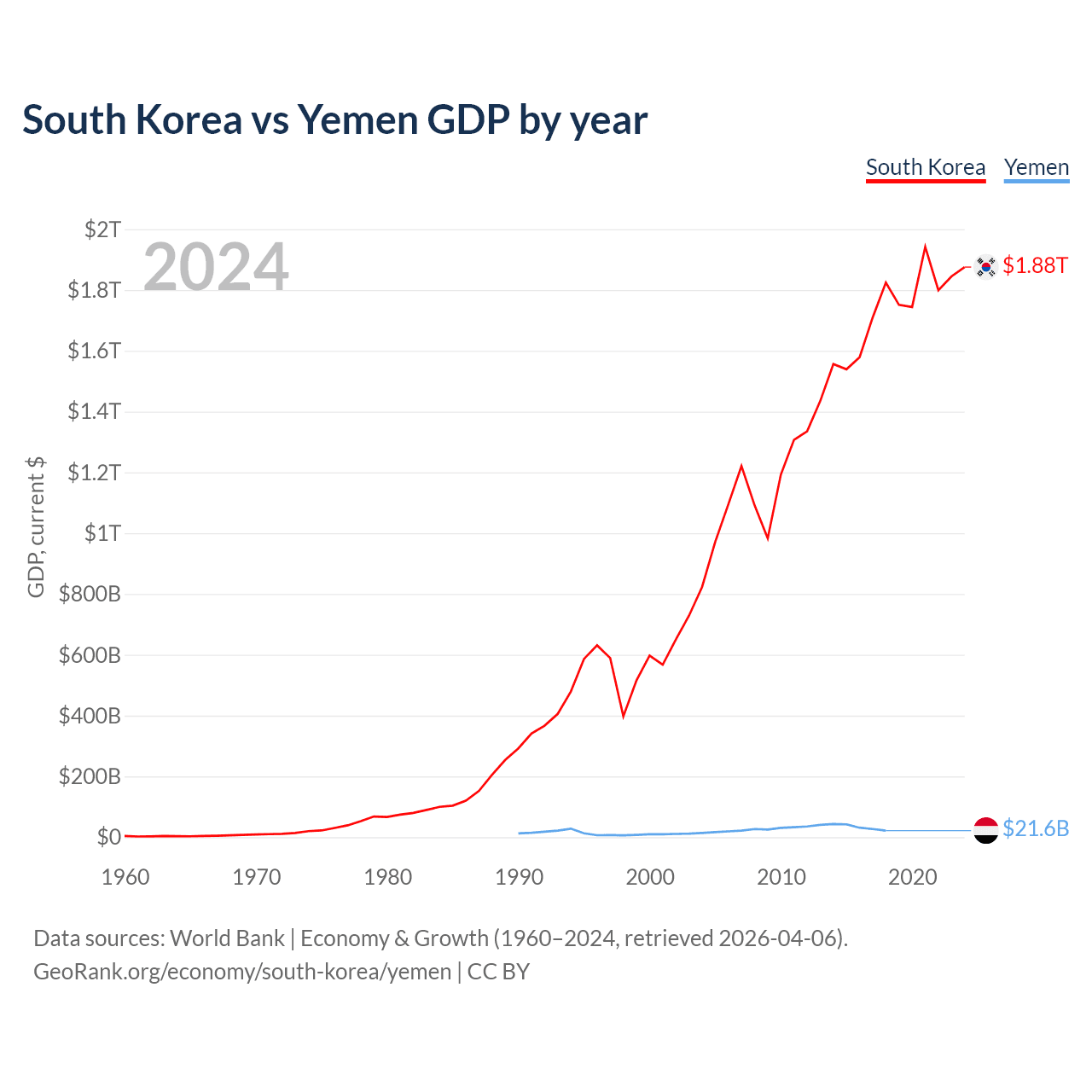 South Korea has a GDP of $1.88T compared to $21.6B for Yemen, ranking 12/197 and 125/197 by economy size, respectively.