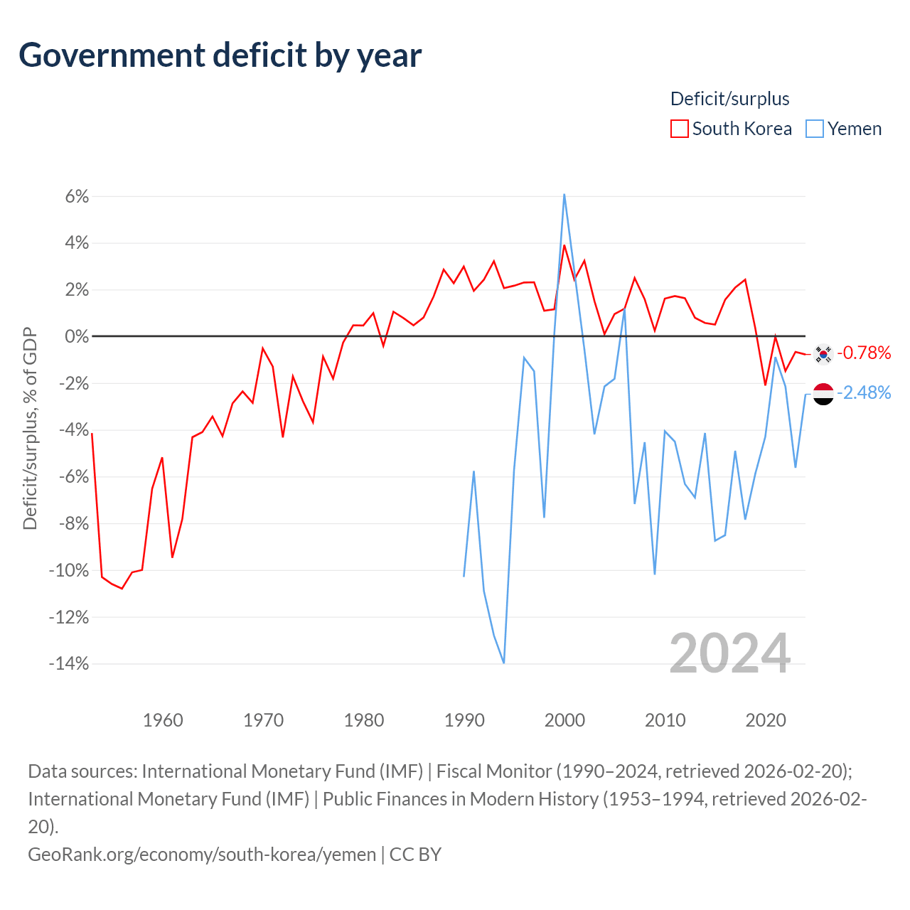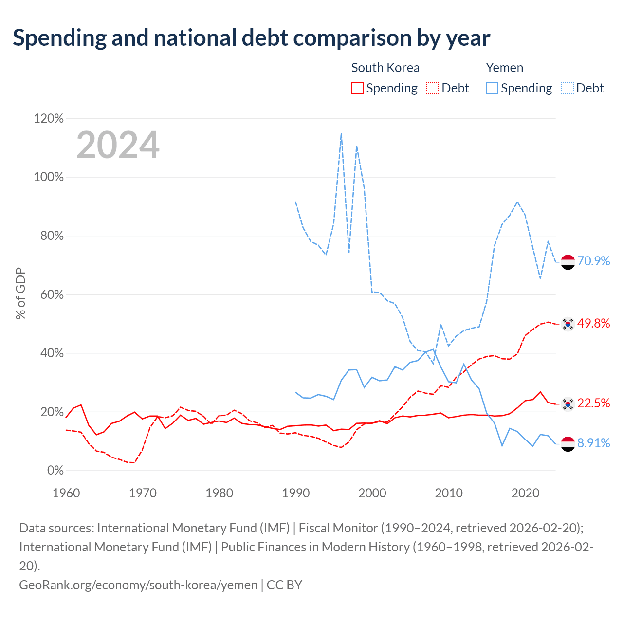 South Korea has $934B in government debt (49.8% of GDP), compared to $18.8B (70.9% of GDP) in Yemen.