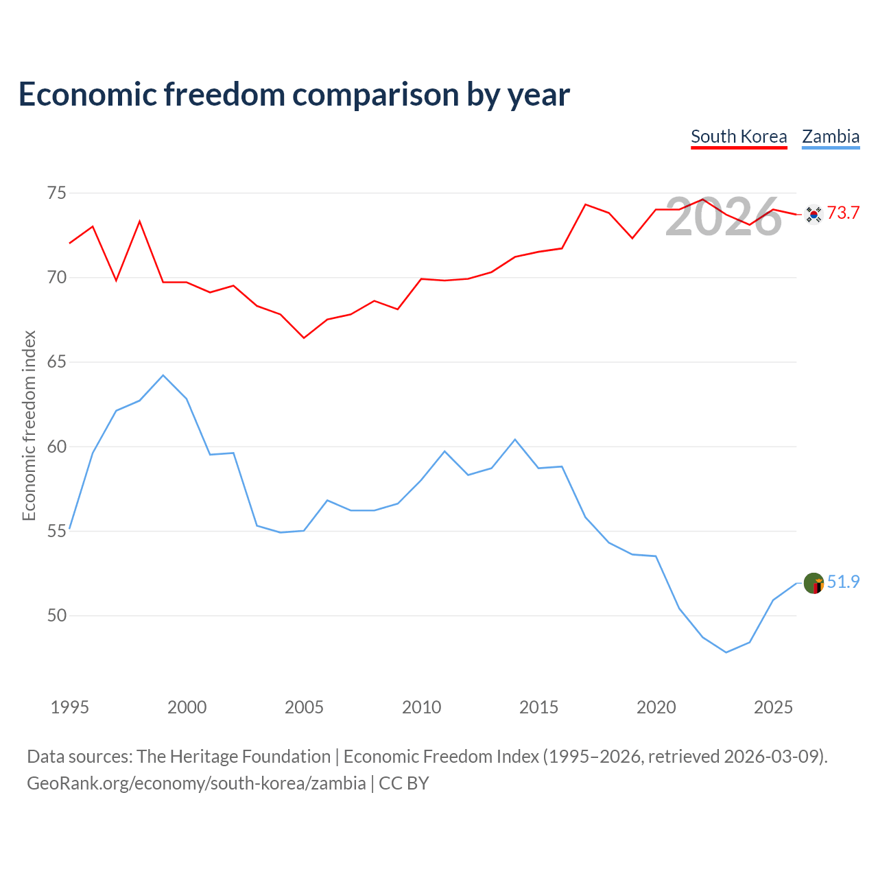 The Economic Freedom Index for South Korea is 73.7, ranking 24/197, compared to 51.9 for Zambia, ranking 152/197. The chart above displays a comparison of annual changes in economic freedom indexes.