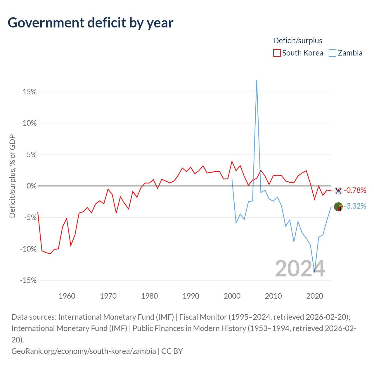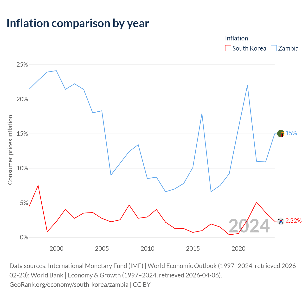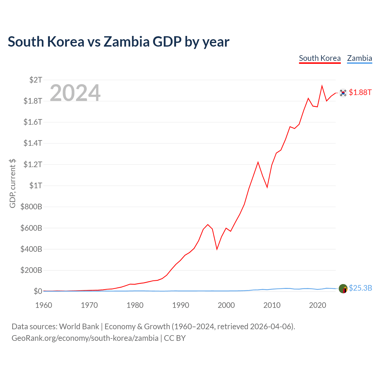 South Korea has a GDP of $1.88T compared to $25.3B for Zambia, ranking 12/197 and 116/197 by economy size, respectively.