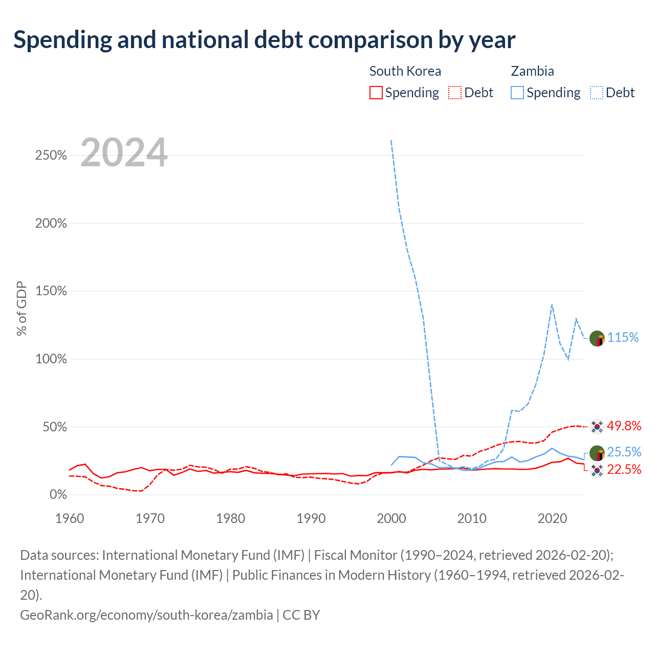 South Korea has $934B in government debt (49.8% of GDP), compared to $29.1B (114.9% of GDP) in Zambia.