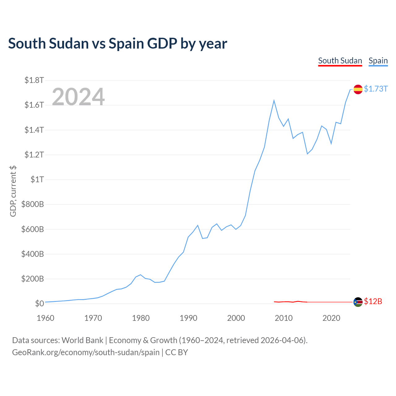 South Sudan has a GDP of $12B compared to $1.73T for Spain, ranking 149/197 and 15/197 by economy size, respectively.