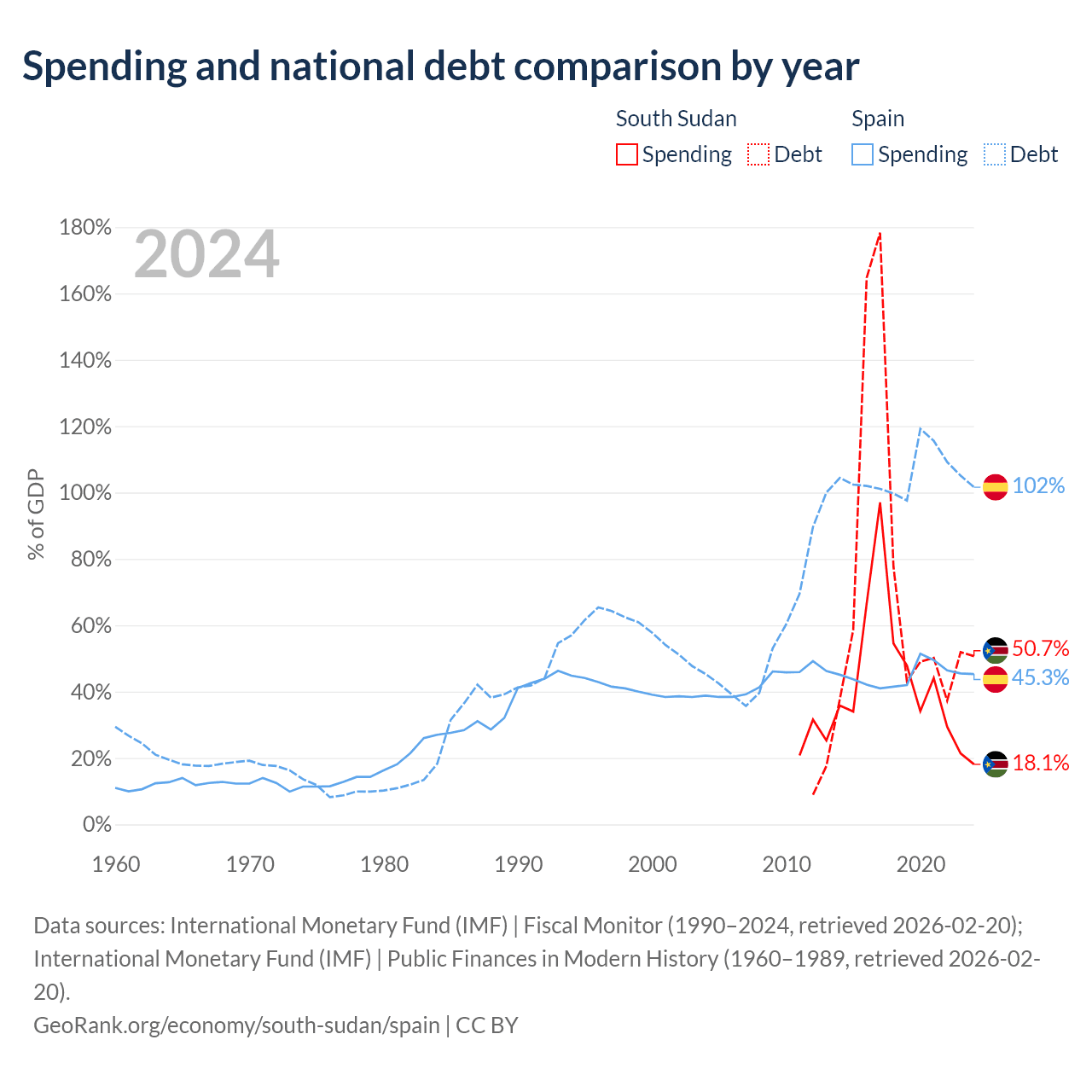 South Sudan has $7.04B in government debt (50.7% of GDP), compared to $1.75T (101.6% of GDP) in Spain.