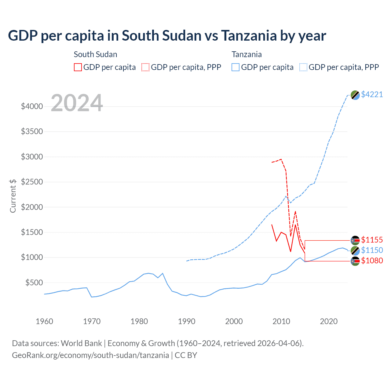 GDP per capita in South Sudan vs Tanzania by year