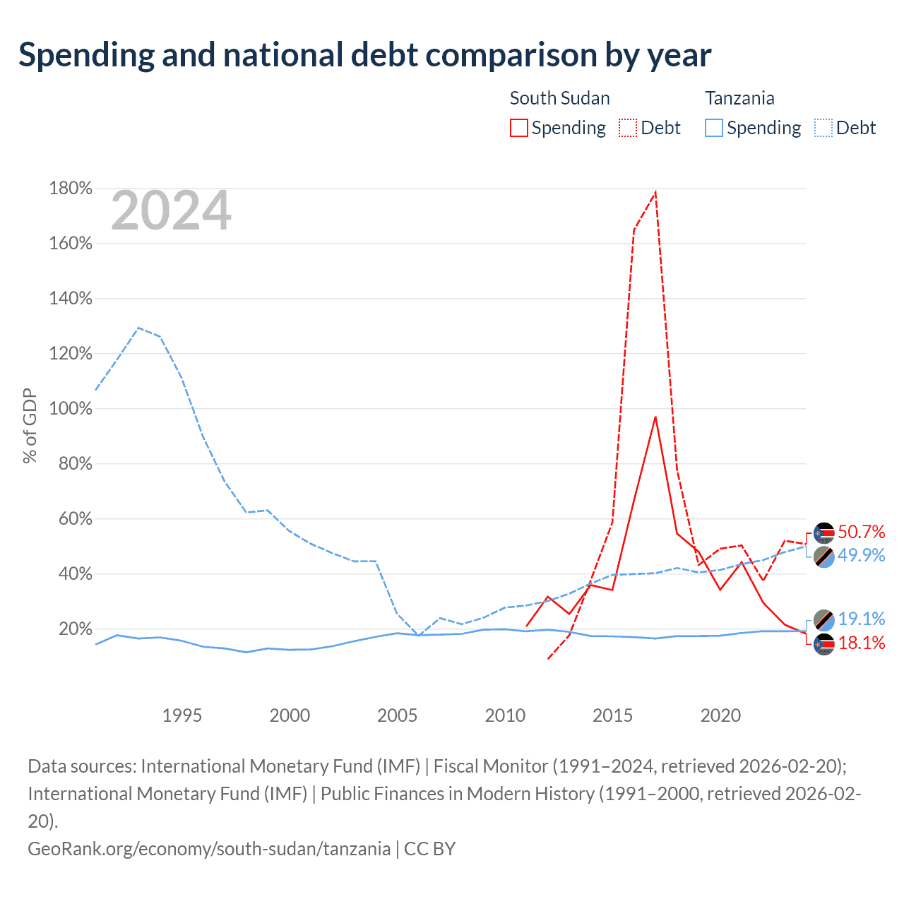 South Sudan has $7.04B in government debt (50.7% of GDP), compared to $39.3B (49.9% of GDP) in Tanzania.