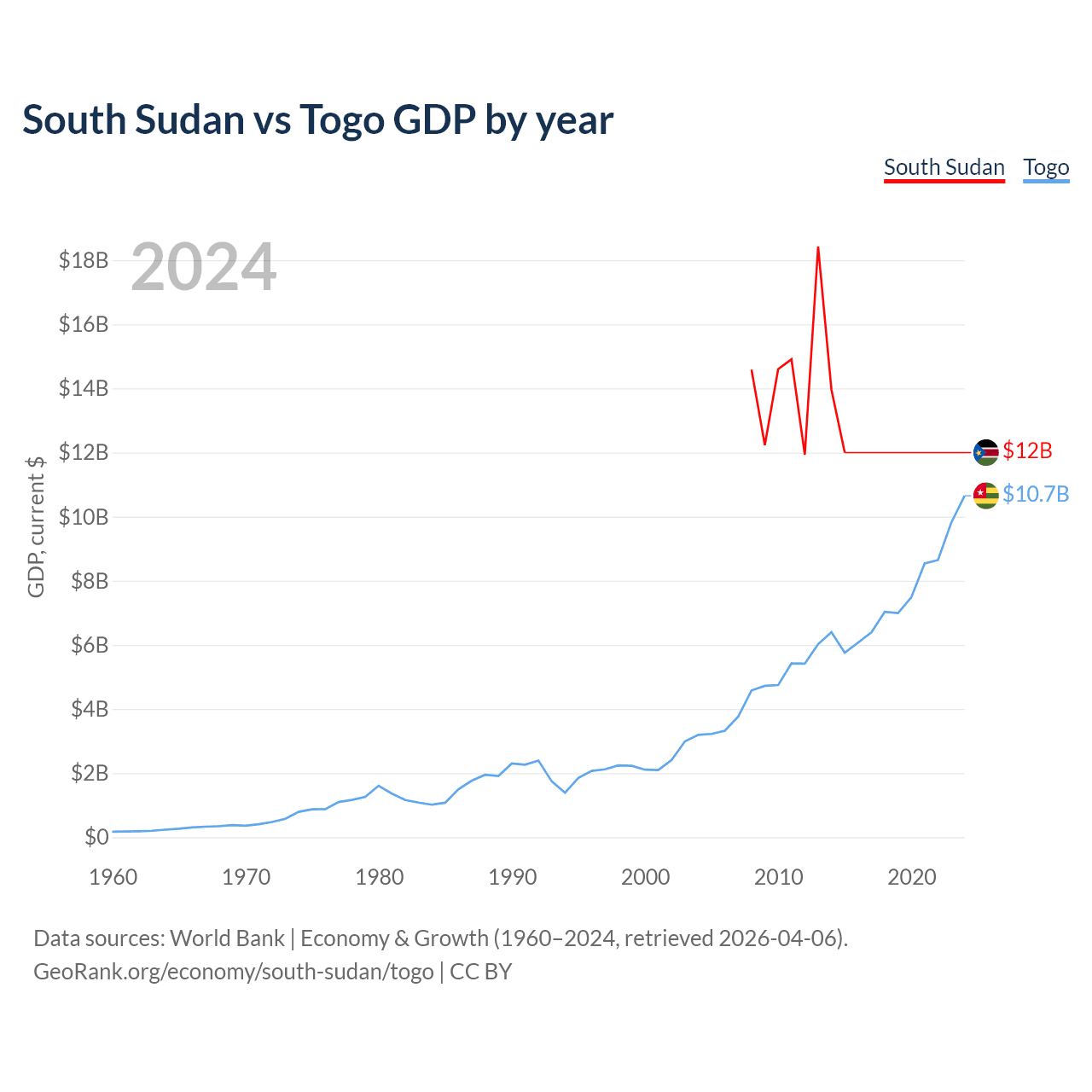 South Sudan has a GDP of $12B compared to $10.7B for Togo, ranking 149/197 and 154/197 by economy size, respectively.