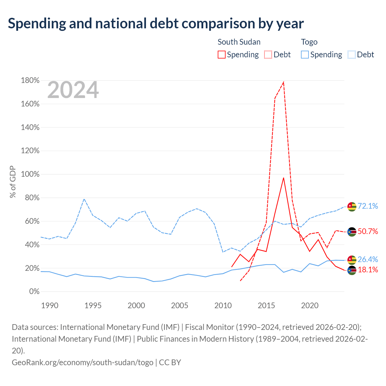 South Sudan has $7.04B in government debt (50.7% of GDP), compared to $7.68B (72.1% of GDP) in Togo.