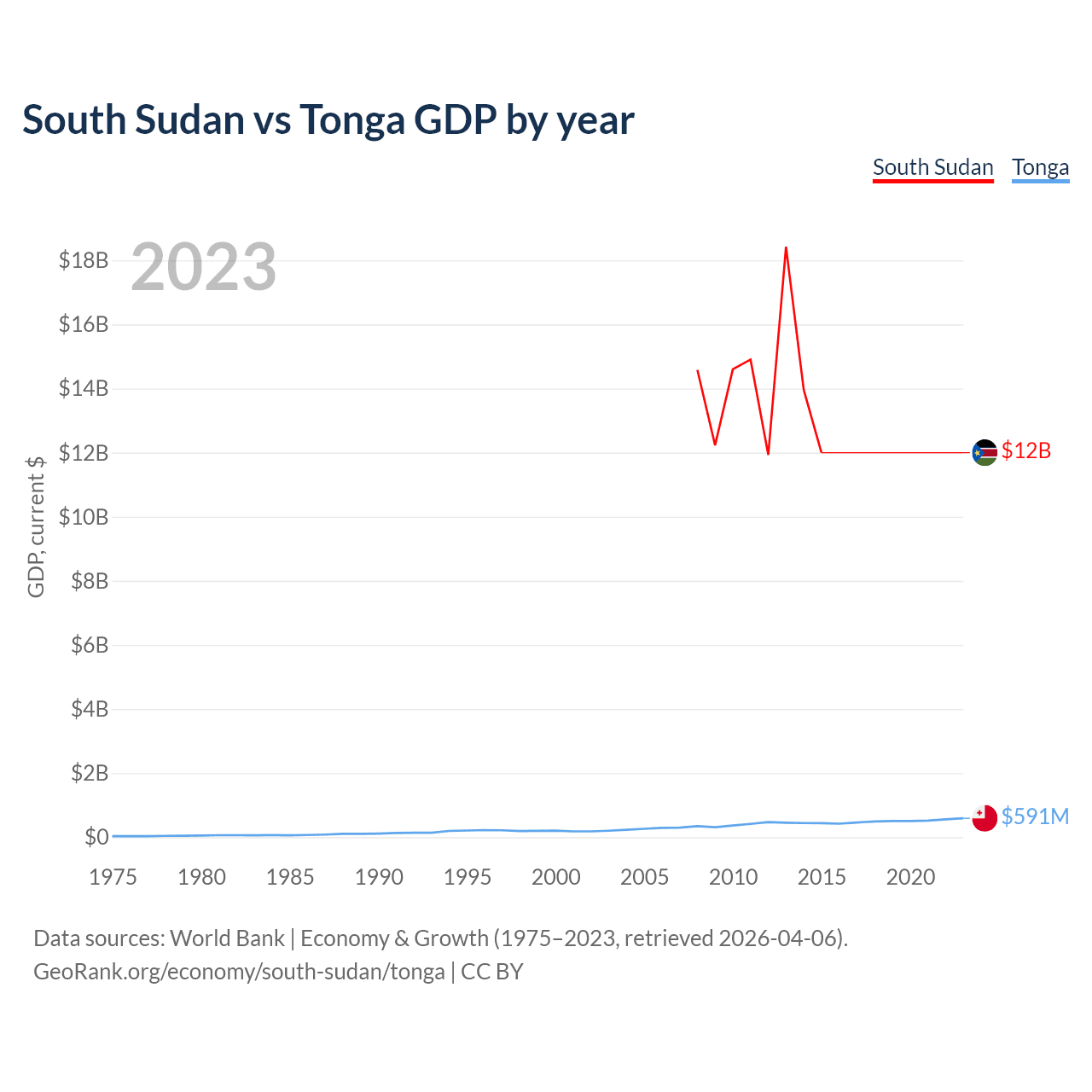 South Sudan has a GDP of $12B compared to $591M for Tonga, ranking 149/197 and 191/197 by economy size, respectively.