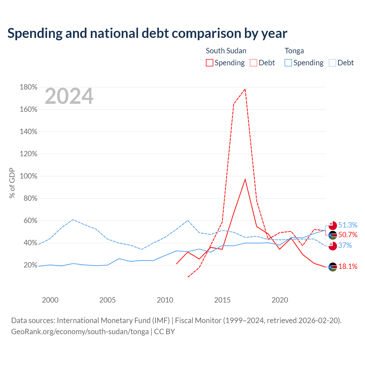 South Sudan has $7.04B in government debt (50.7% of GDP), compared to $256M (37% of GDP) in Tonga.