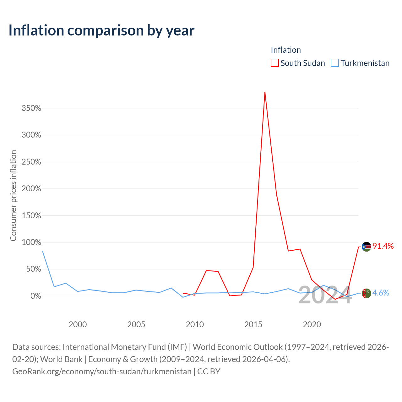 Over the past 16 years, South Sudan has recorded an average annual inflation rate of 63.7%, compared with 6.39% in Turkmenistan. In 2024, inflation was 91.4% in South Sudan and 4.6% in Turkmenistan.