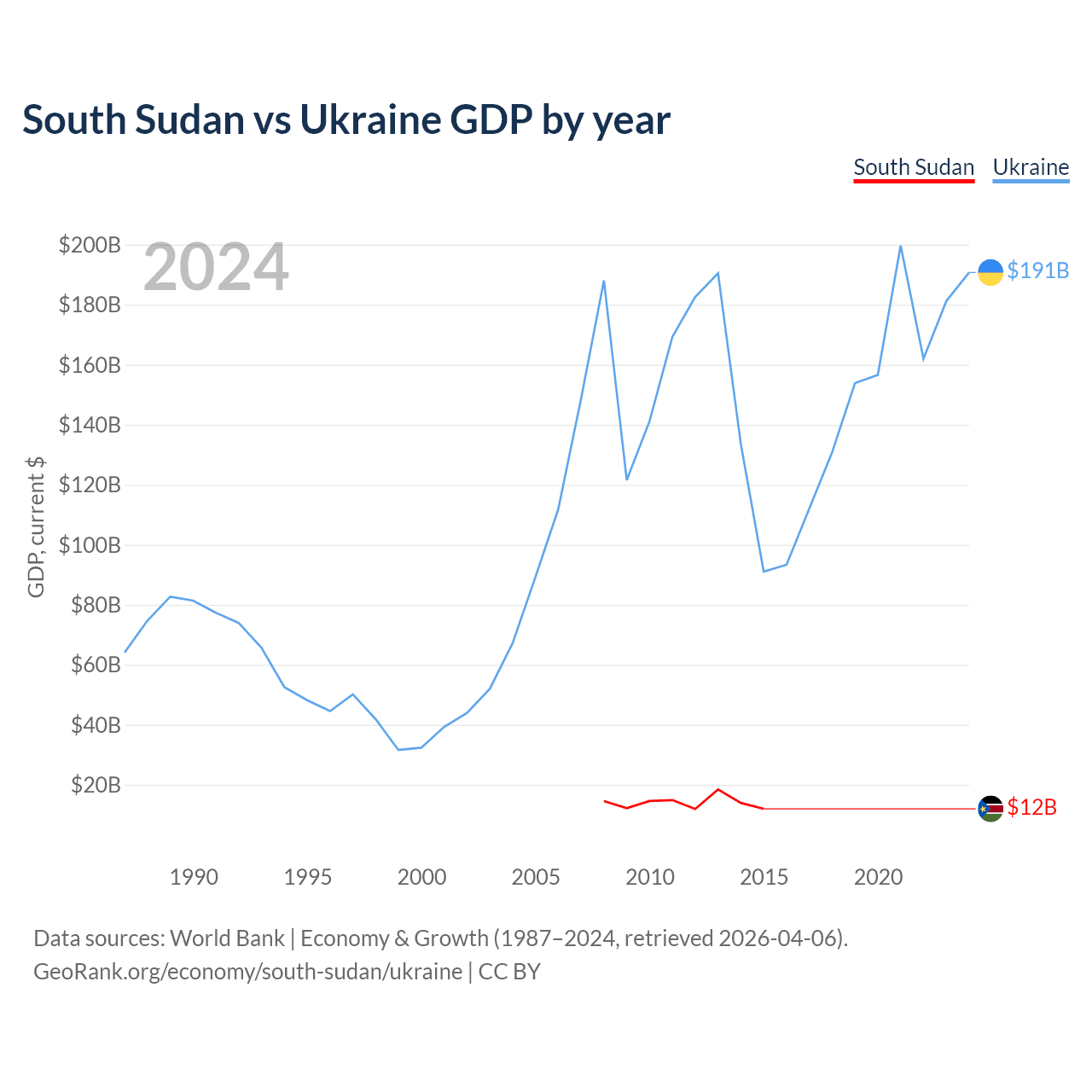 South Sudan has a GDP of $12B compared to $191B for Ukraine, ranking 149/197 and 57/197 by economy size, respectively.
