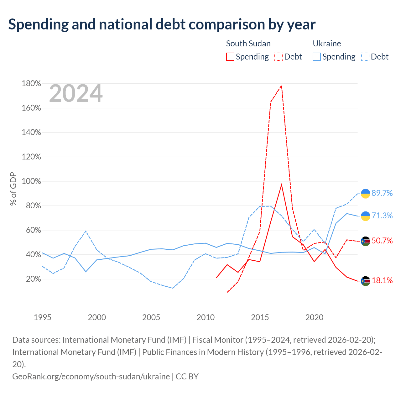 South Sudan has $7.04B in government debt (50.7% of GDP), compared to $171B (89.7% of GDP) in Ukraine.