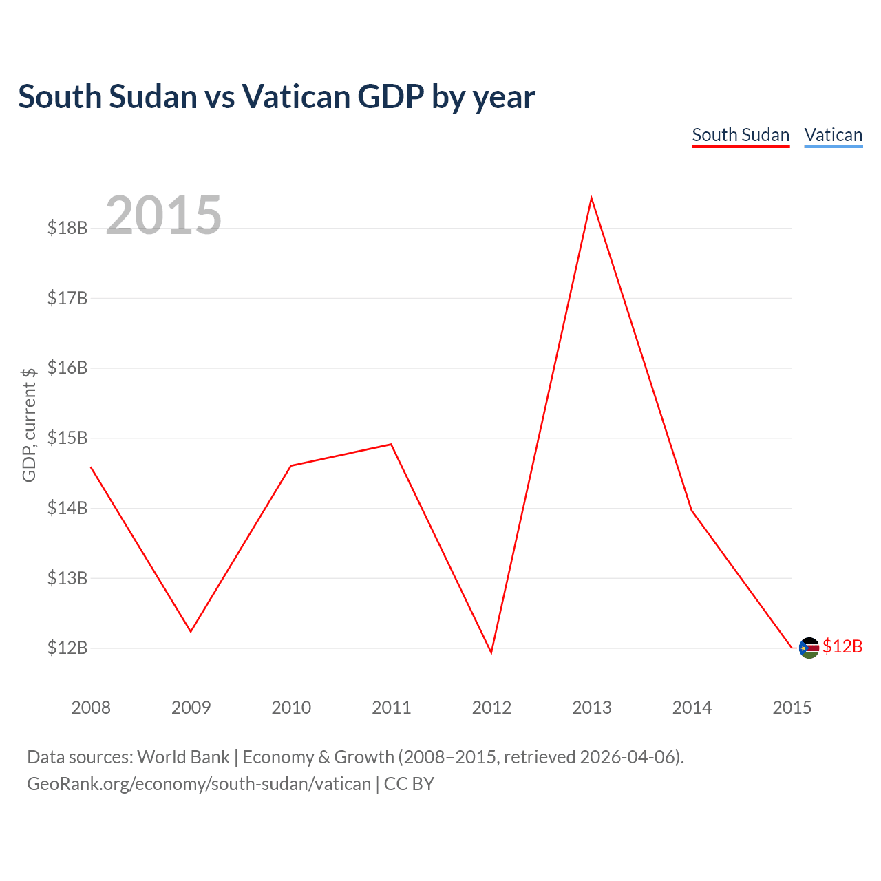 South Sudan has a GDP of $12B compared to $19.8M for the Vatican, ranking 149/197 and 197/197 by economy size, respectively.