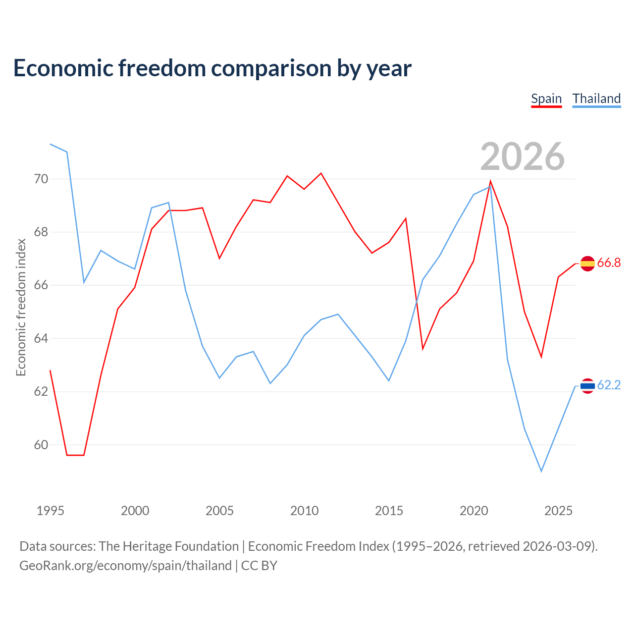 The Economic Freedom Index for Spain is 66.8, ranking 59/197, compared to 62.2 for Thailand, ranking 88/197. The chart above displays a comparison of annual changes in economic freedom indexes.