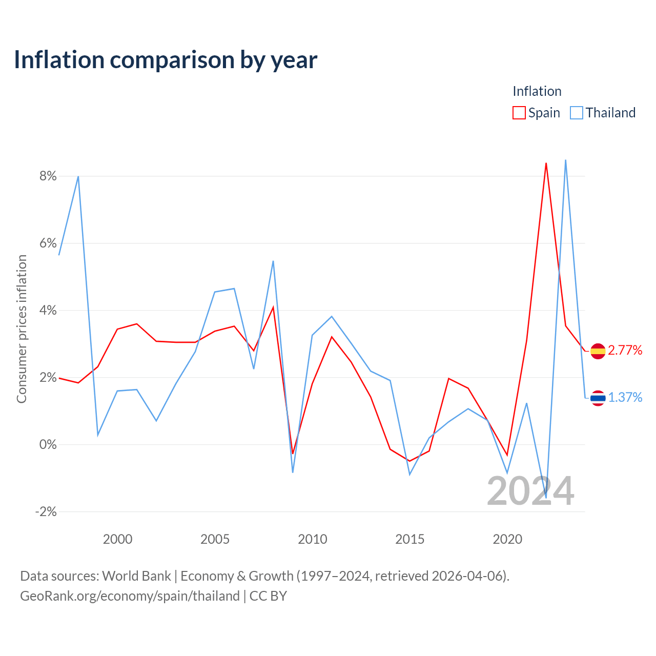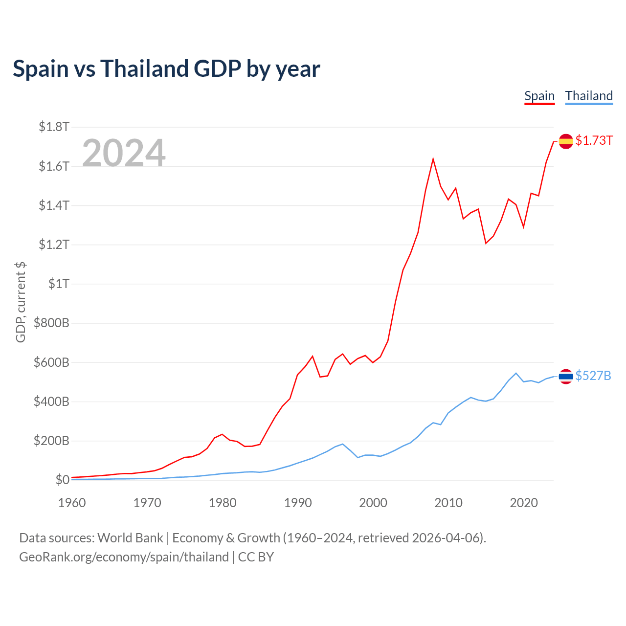 Spain has a GDP of $1.73T compared to $527B for Thailand, ranking 15/197 and 31/197 by economy size, respectively.