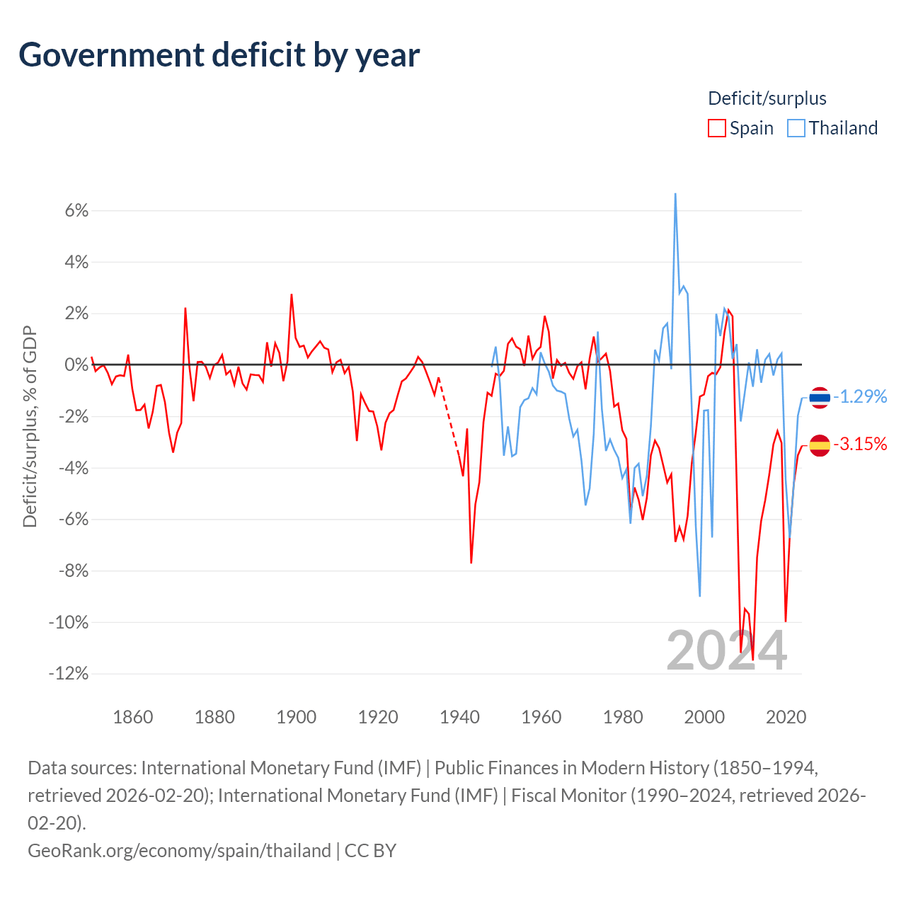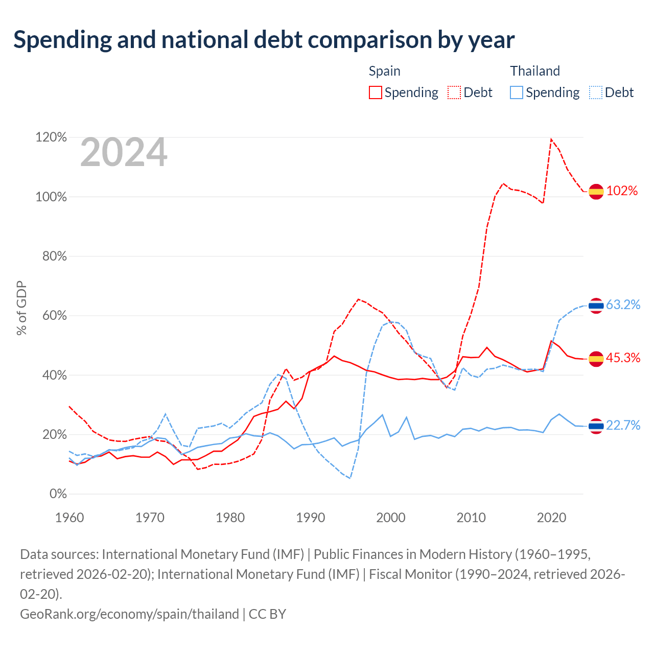 Spain has $1.75T in government debt (101.6% of GDP), compared to $333B (63.2% of GDP) in Thailand.