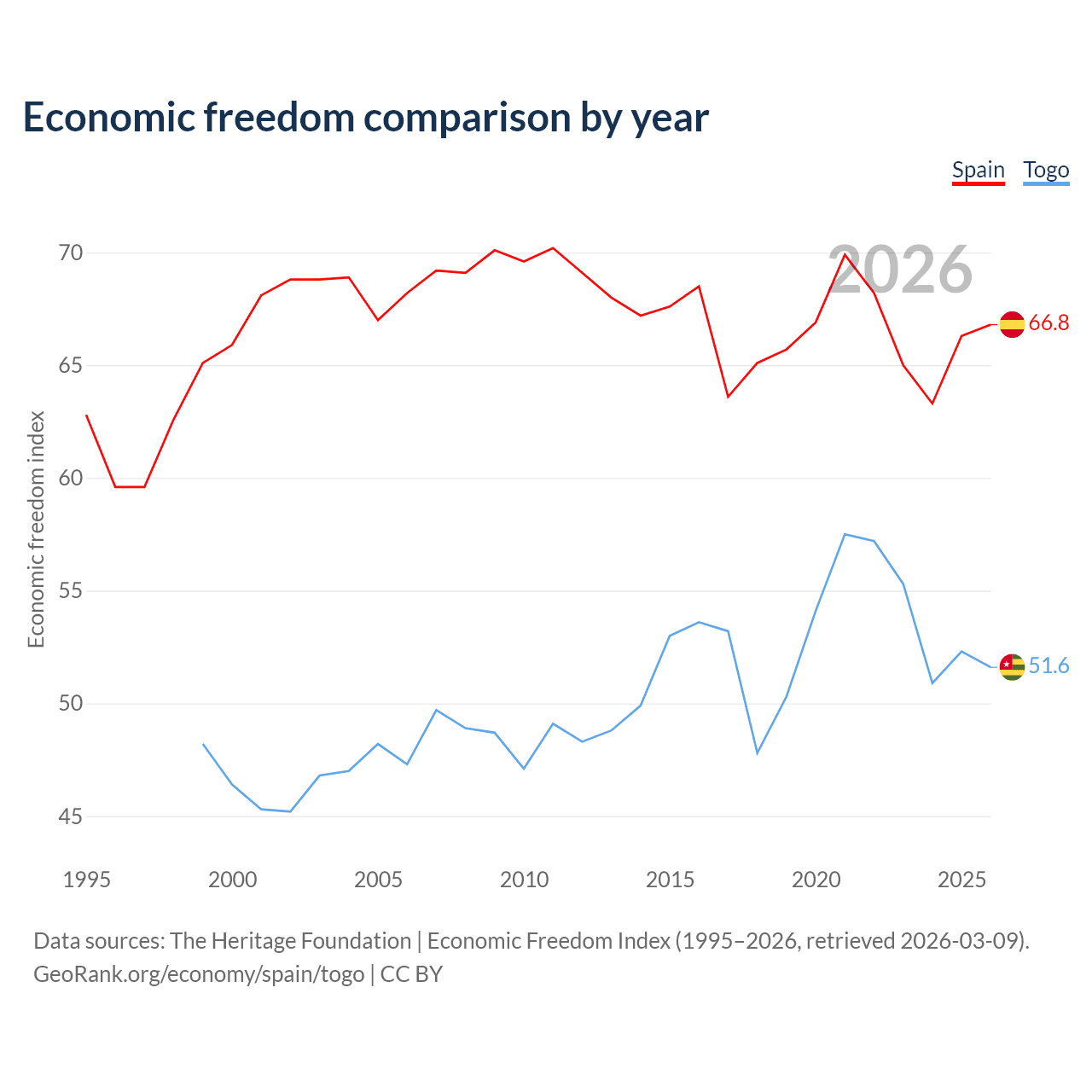 The Economic Freedom Index for Spain is 66.8, ranking 59/197, compared to 51.6 for Togo, ranking 153/197. The chart above displays a comparison of annual changes in economic freedom indexes.