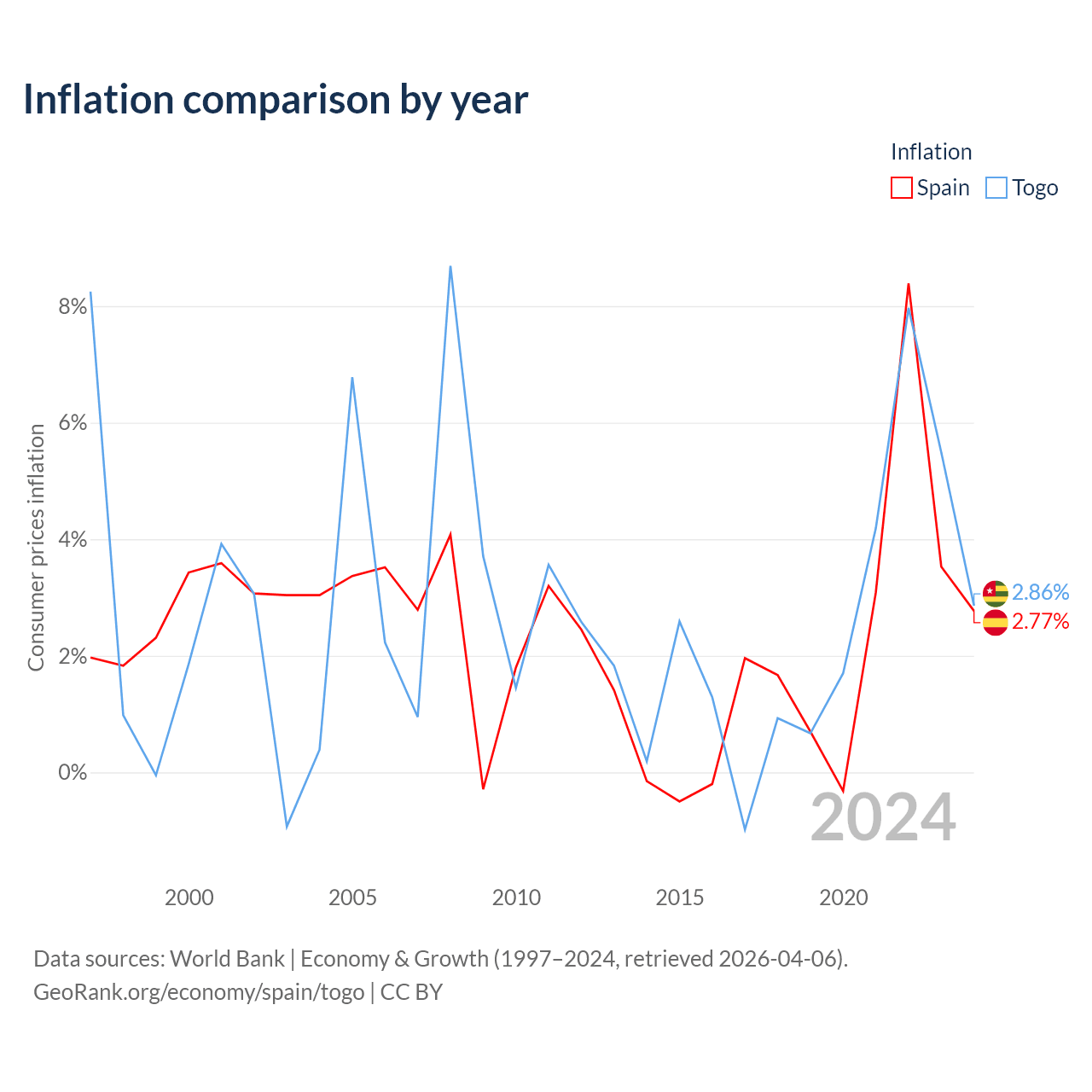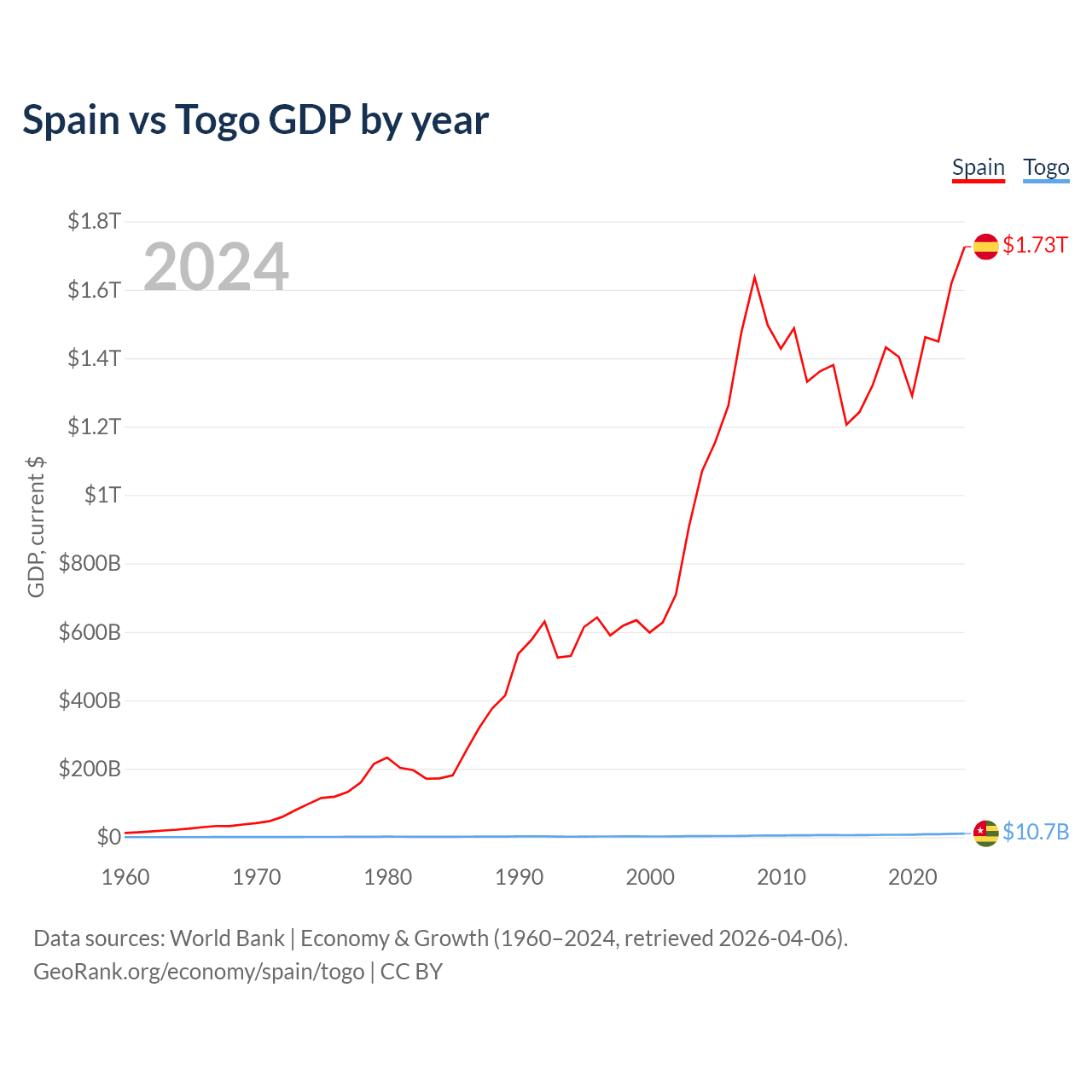 Spain has a GDP of $1.73T compared to $10.7B for Togo, ranking 15/197 and 154/197 by economy size, respectively.