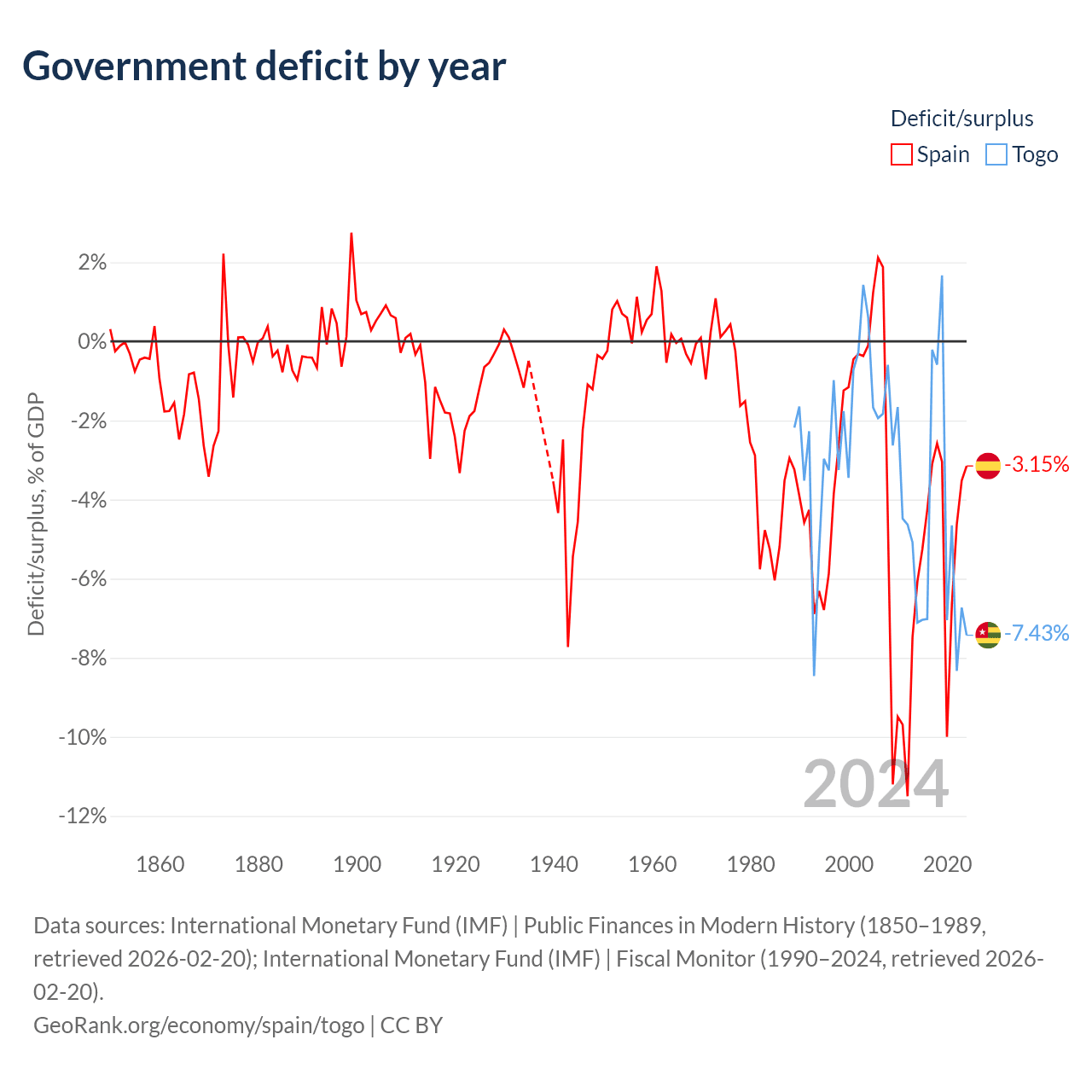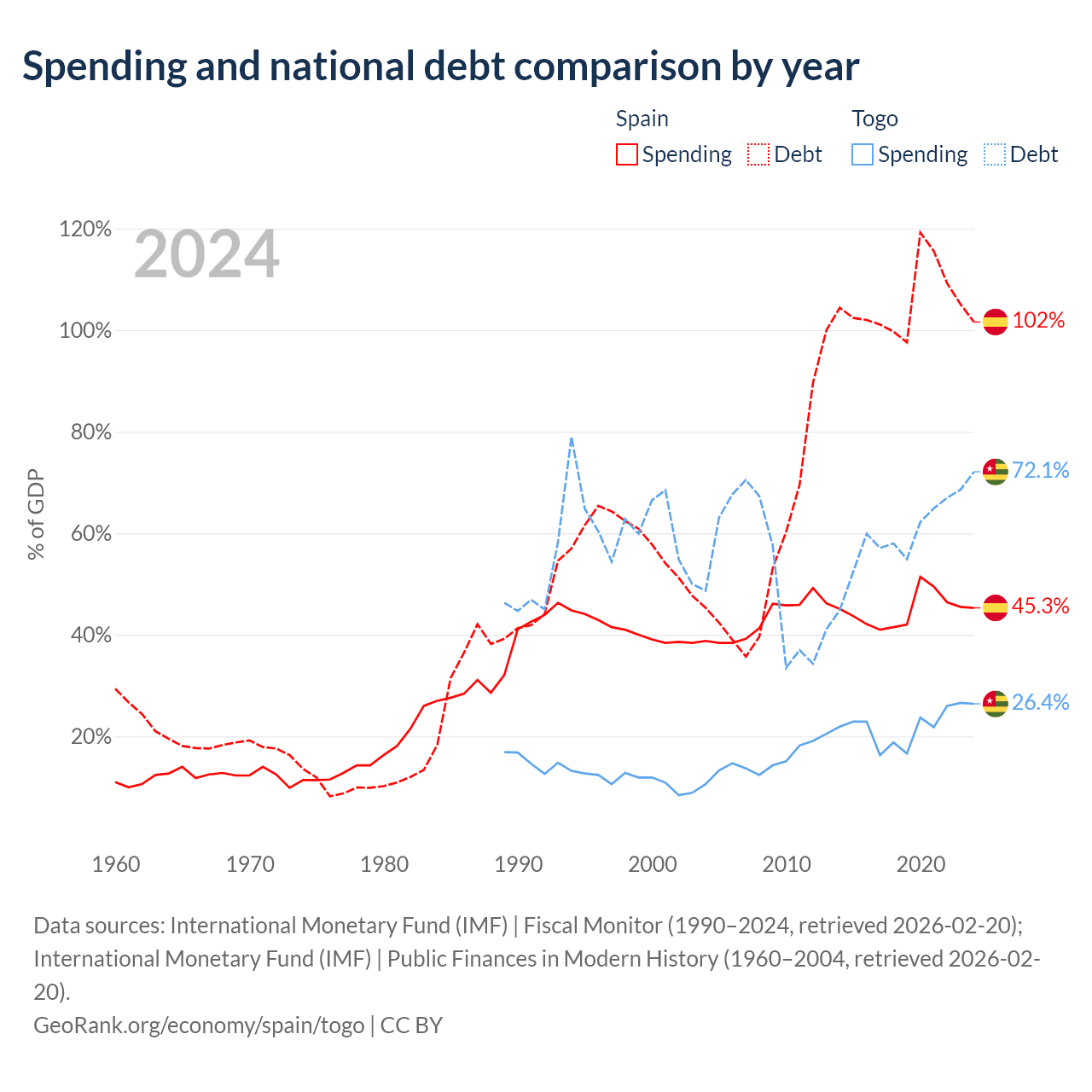 Spain has $1.75T in government debt (101.6% of GDP), compared to $7.68B (72.1% of GDP) in Togo.