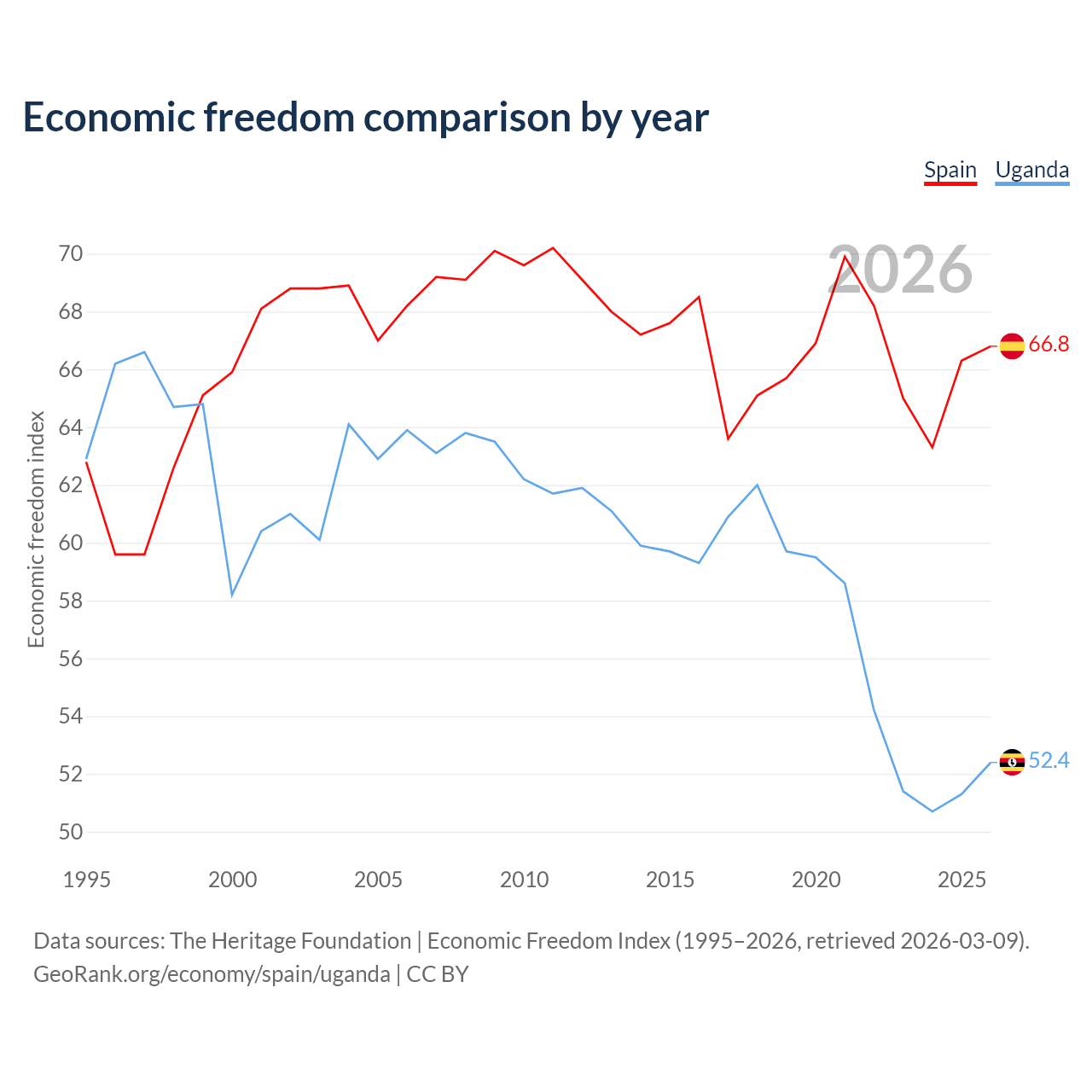 The Economic Freedom Index for Spain is 66.8, ranking 59/197, compared to 52.4 for Uganda, ranking 149/197. The chart above displays a comparison of annual changes in economic freedom indexes.