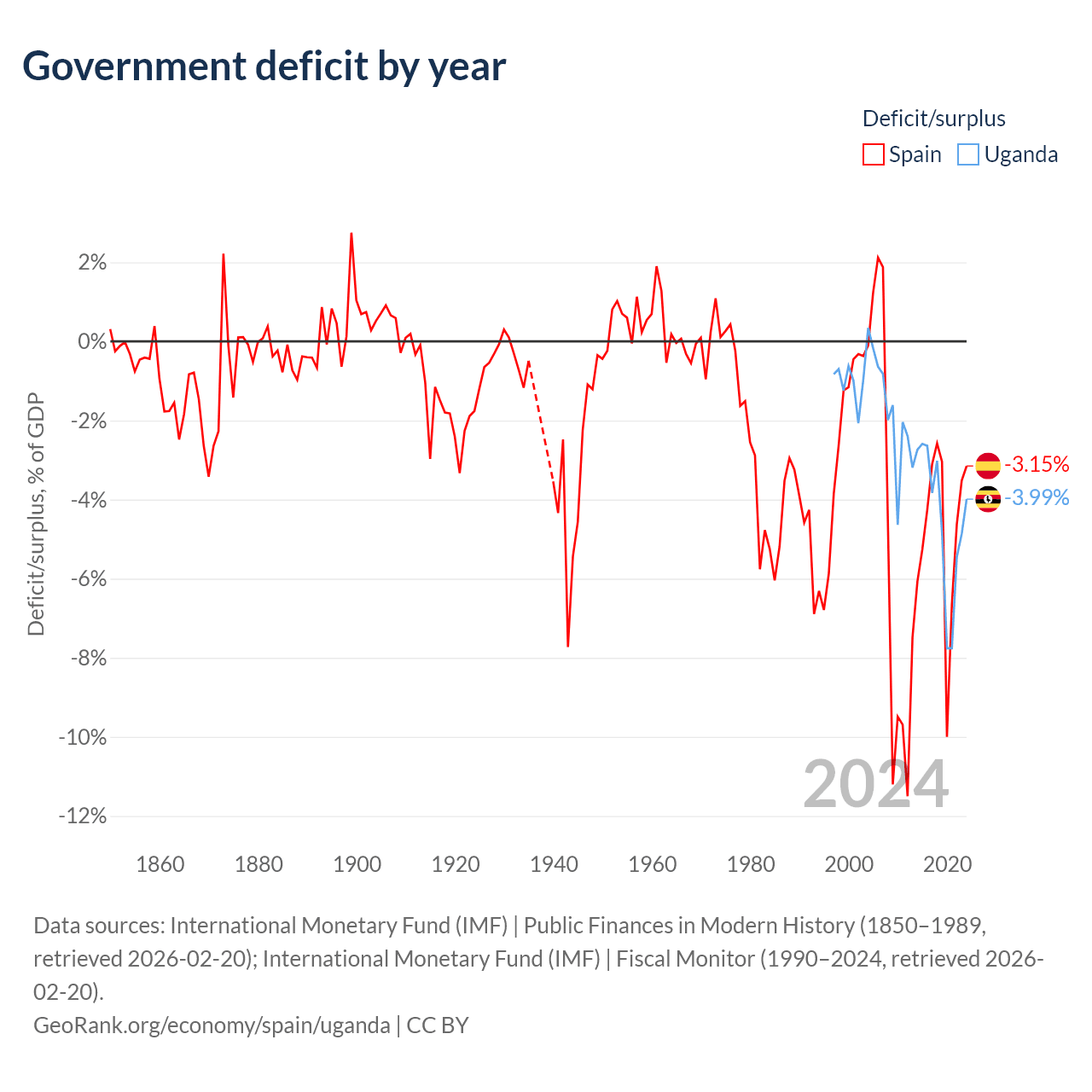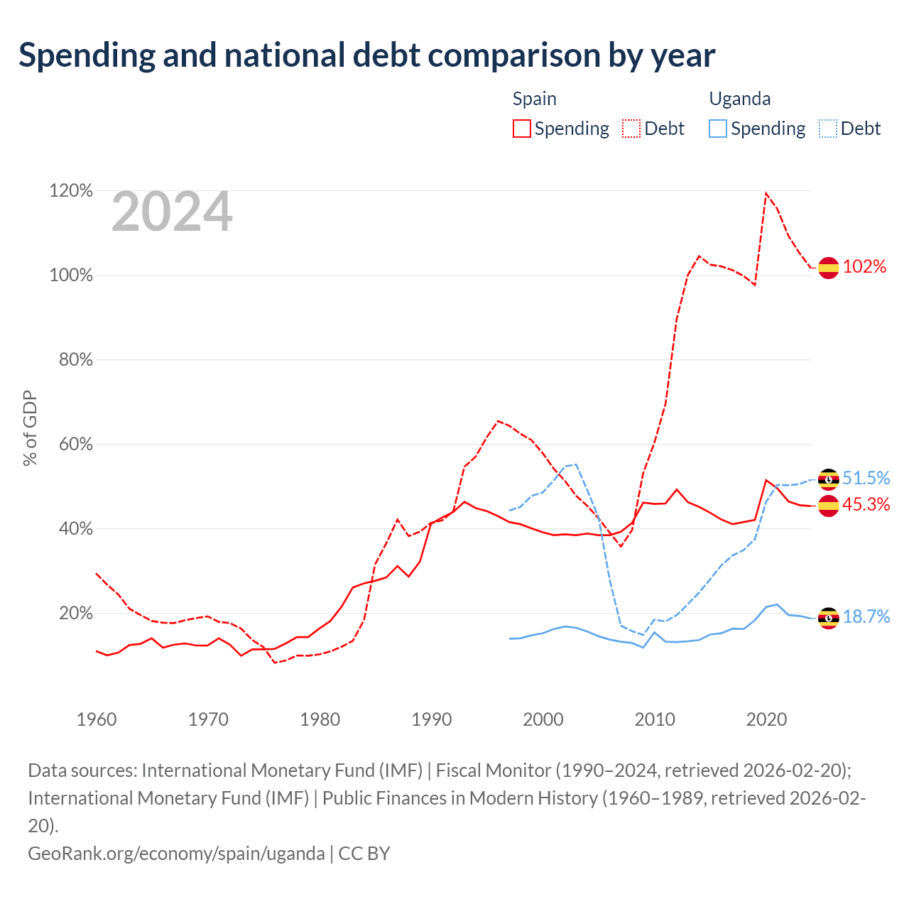 Spain has $1.75T in government debt (101.6% of GDP), compared to $27.8B (51.5% of GDP) in Uganda.