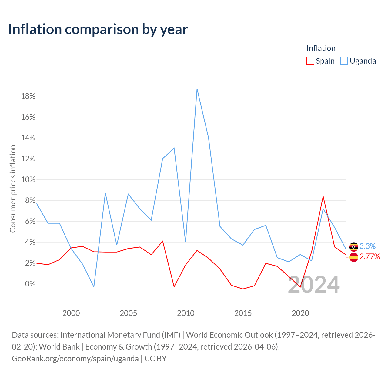 Spain has a GDP of $1.73T compared to $53.9B for Uganda, ranking 15/197 and 89/197 by economy size, respectively.