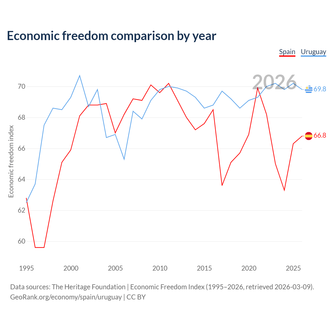The Economic Freedom Index for Spain is 66.8, ranking 59/197, compared to 69.8 for Uruguay, ranking 39/197. The chart above displays a comparison of annual changes in economic freedom indexes.
