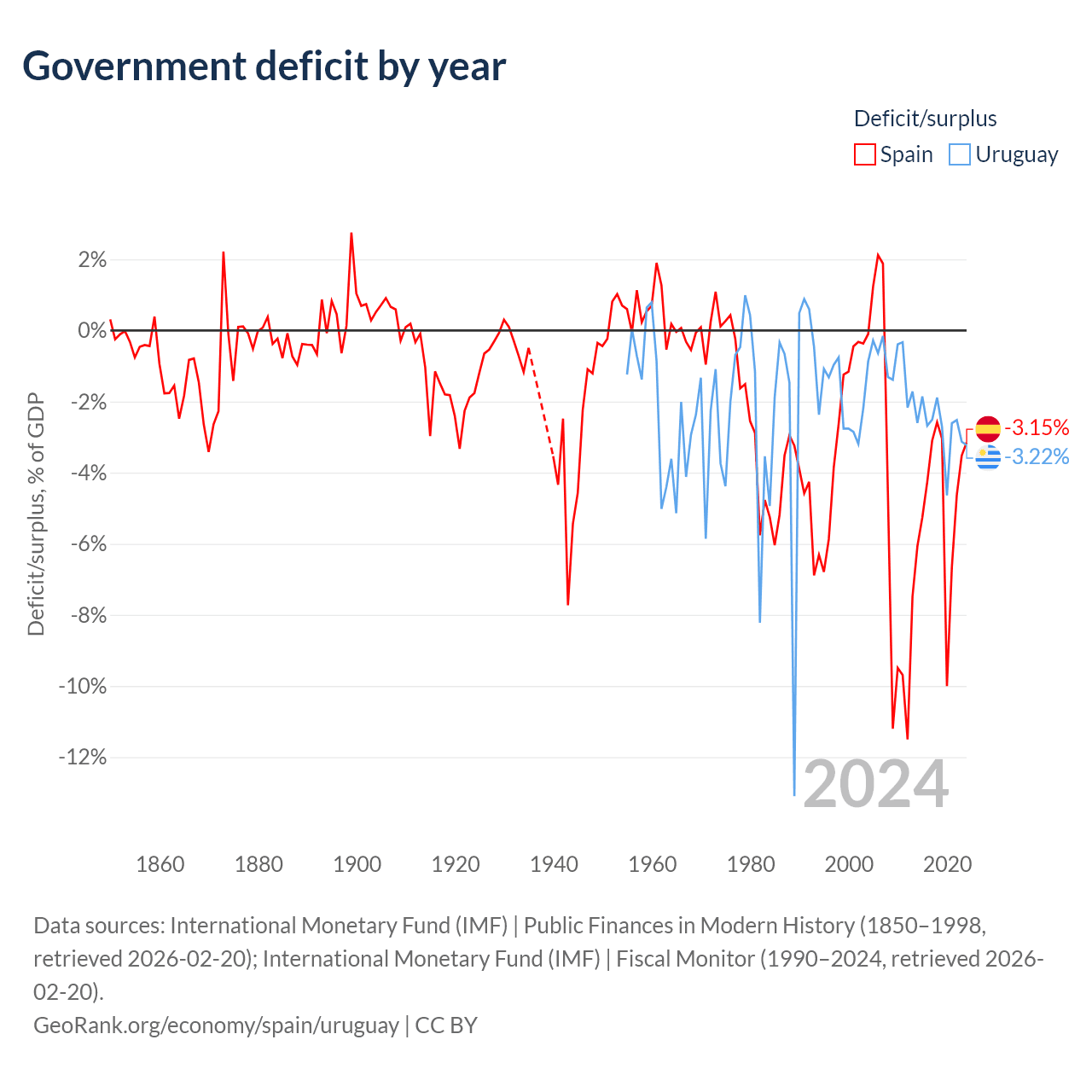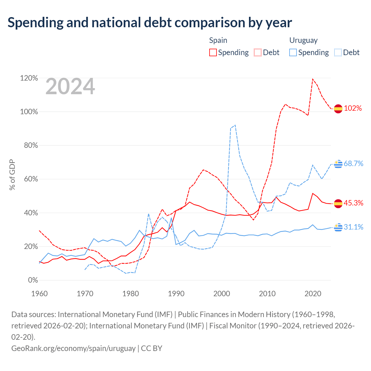 Spain has $1.75T in government debt (101.6% of GDP), compared to $55.6B (68.7% of GDP) in Uruguay.