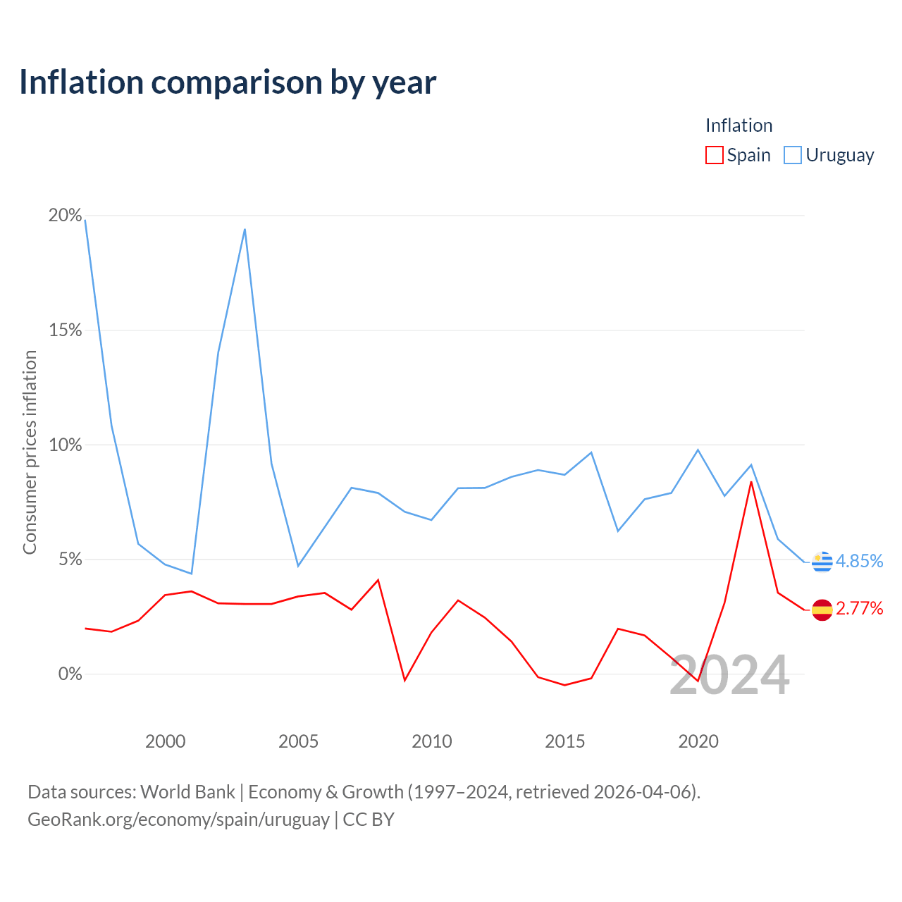 Spain has a GDP of $1.73T compared to $81B for Uruguay, ranking 15/197 and 81/197 by economy size, respectively.