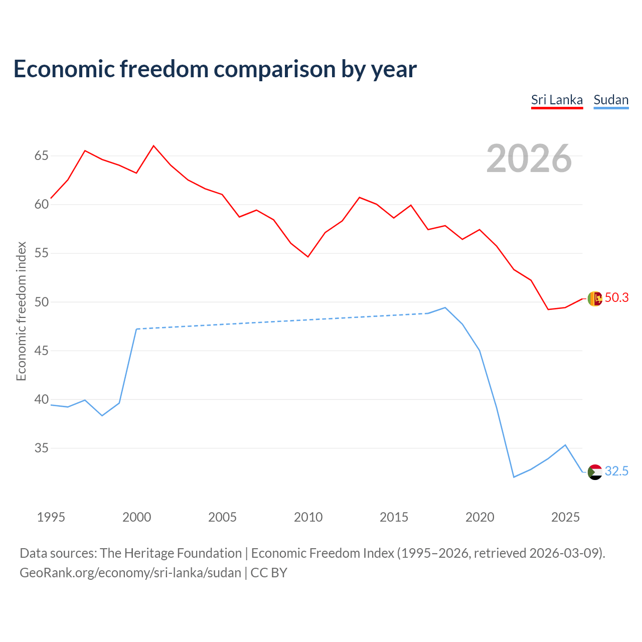 The Economic Freedom Index for Sri Lanka is 50.3, ranking 162/197, compared to 32.5 for Sudan, ranking 191/197. The chart above displays a comparison of annual changes in economic freedom indexes.