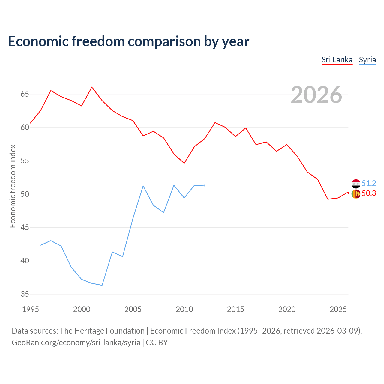 The Economic Freedom Index for Sri Lanka is 50.3, ranking 162/197, compared to 51.2 for Syria, ranking 155/197. The chart above displays a comparison of annual changes in economic freedom indexes.