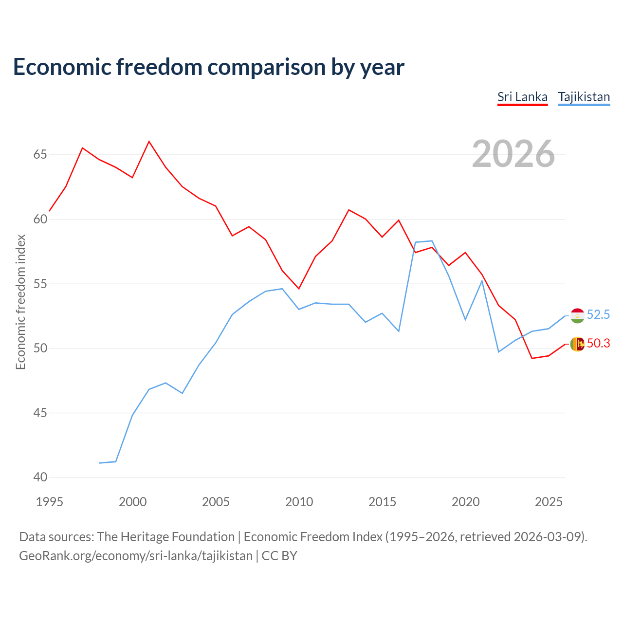 The Economic Freedom Index for Sri Lanka is 50.3, ranking 162/197, compared to 52.5 for Tajikistan, ranking 147/197. The chart above displays a comparison of annual changes in economic freedom indexes.